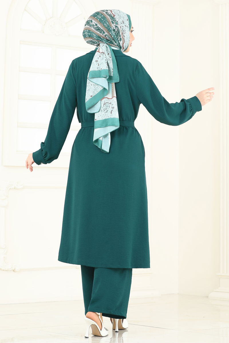 Ürün Detayları : Yeni sezon tesettür moda ürünüdür. Üründe Kruvaze yaka bulunmaktadır. Astar yoktur. Kemer, ürünle birlikte verilir ve kullanımı isteğe bağlıdır. Bluz, sete dahil değildir, sadece kombin amaçlı kullanılmıştır. Ürün aksesuarlarını içermez. Pantolonun bel kısmı lastiklidir ve Manşetler düğmeli aktif kullanıma sahiptir. Fotoğraf çekimi sırasında renklerde değişiklik gözlemlenebilir.