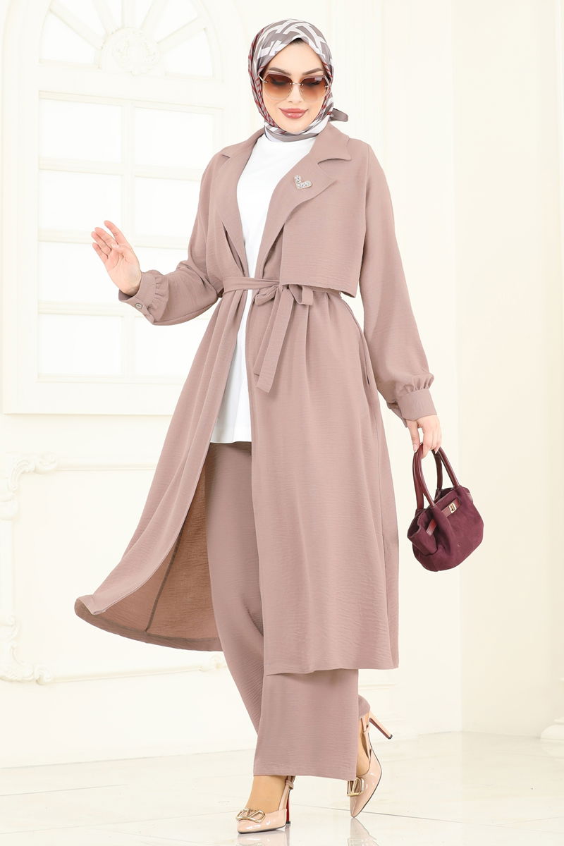Ürün Detayları : Modaya uygun tesettür giyim ürünüdür. Kruvaze yaka çizgisine sahiptir. Astar içermez. Kemer ürünle birlikte geliyor ama zorunlu değil. Bluz sete dahil değildir; sadece kombin önerisi olarak sunulmuştur. Ürün aksesuar içermez. Pantolon beli lastikli ve manşet düğmeleri aktif bir şekilde kullanılabilir. Fotoğraf çekimlerinden kaynaklı renk farklılıkları olabilir.