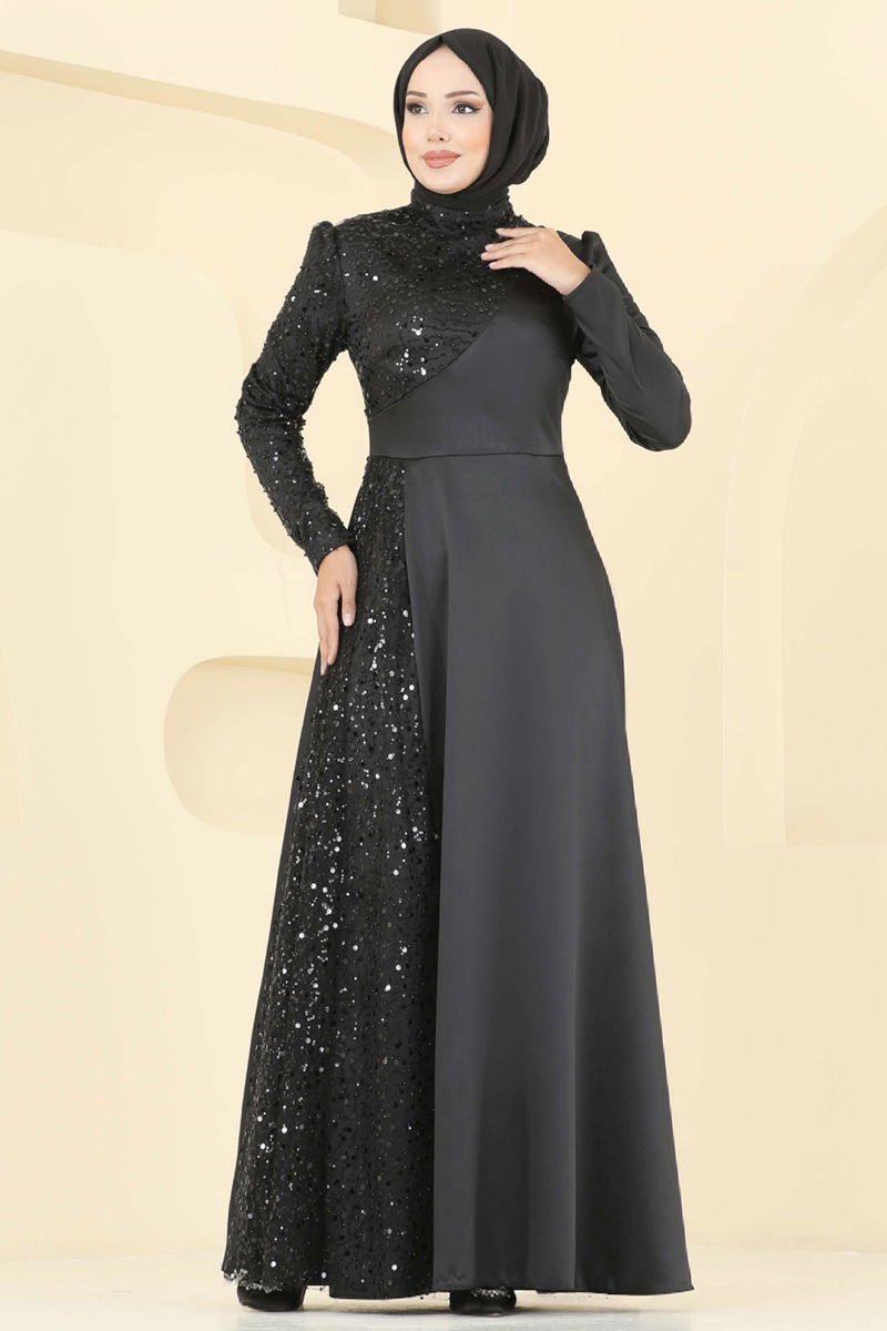 Boncuk Detaylı Saten Abiye 2818ELC1143-MS Siyah