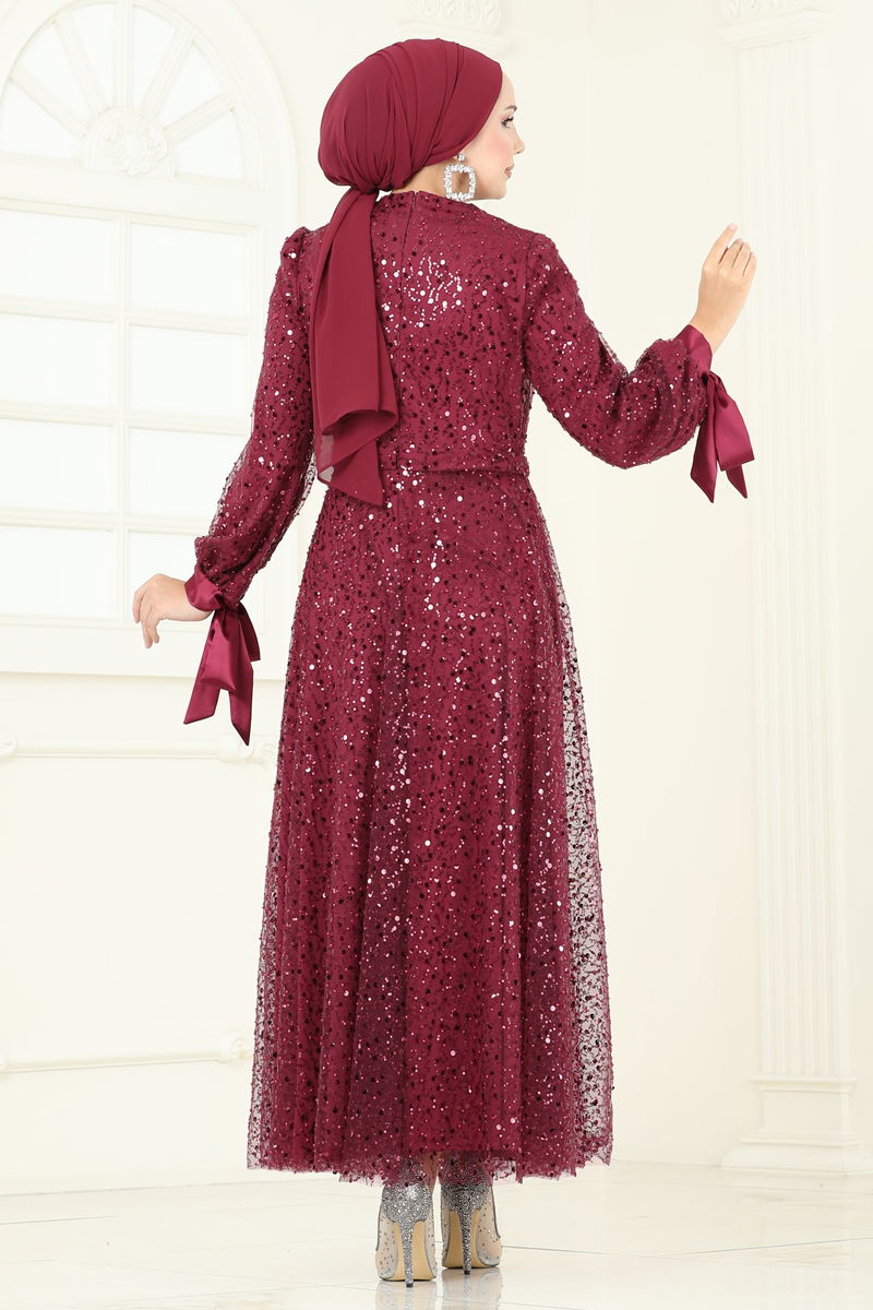 Boncuk Detaylı Tül Abiye 2822ELC1143-MS Bordo