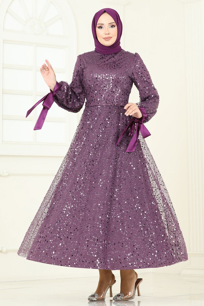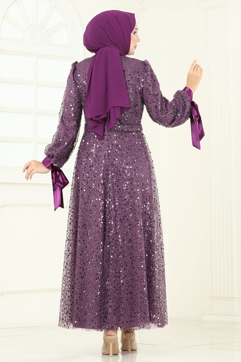 Boncuk Detaylı Tül Abiye 2822ELC1143-MS Mürdüm