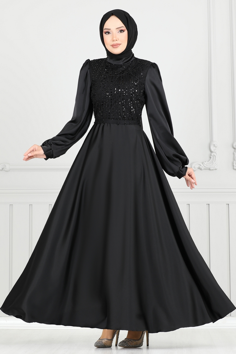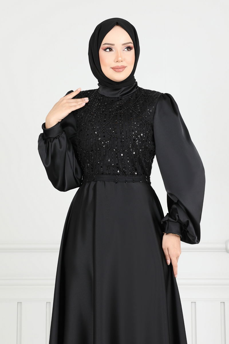 Boncuk İşlemeli Saten Abiye 5691EDF311-MS Siyah