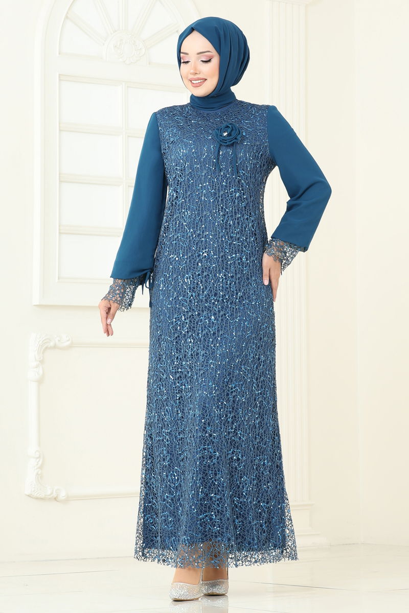 Broşlu Tesettür Abiye Elbise 2517ELC1143-MS Petrol