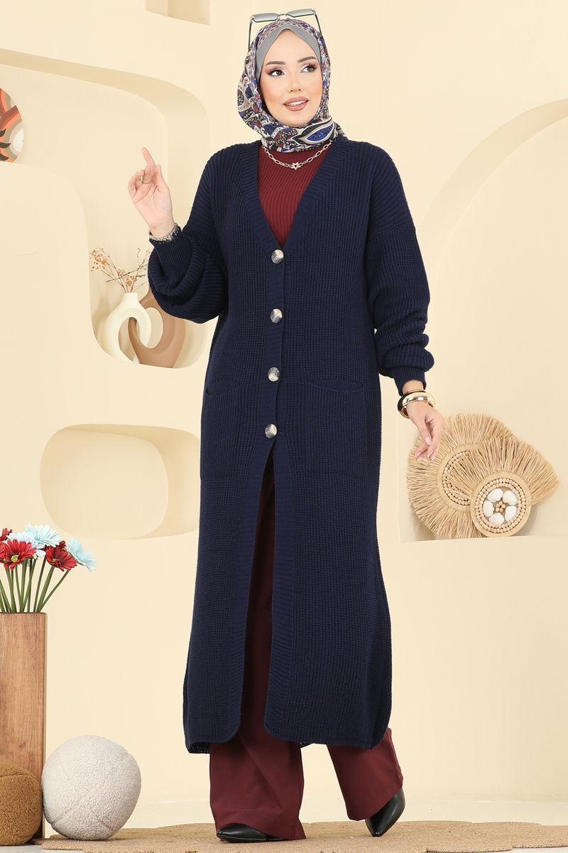 The essential piece of the new season, the V-Neck Knit Cardigan, is designed to keep you warm during the fall and winter months. With its delicate knit fabric, it offers a soft touch. This cardigan, which can be cleaned with a gentle wash at 30 degrees, provides both practical and stylish use with its button-down front design and pocketed structure. Suitable for modest wear, this model is offered in a wide range from sizes 36 to 52. This cardigan, ideal for everyday wear to special occasions, will be a staple in your wardrobe.