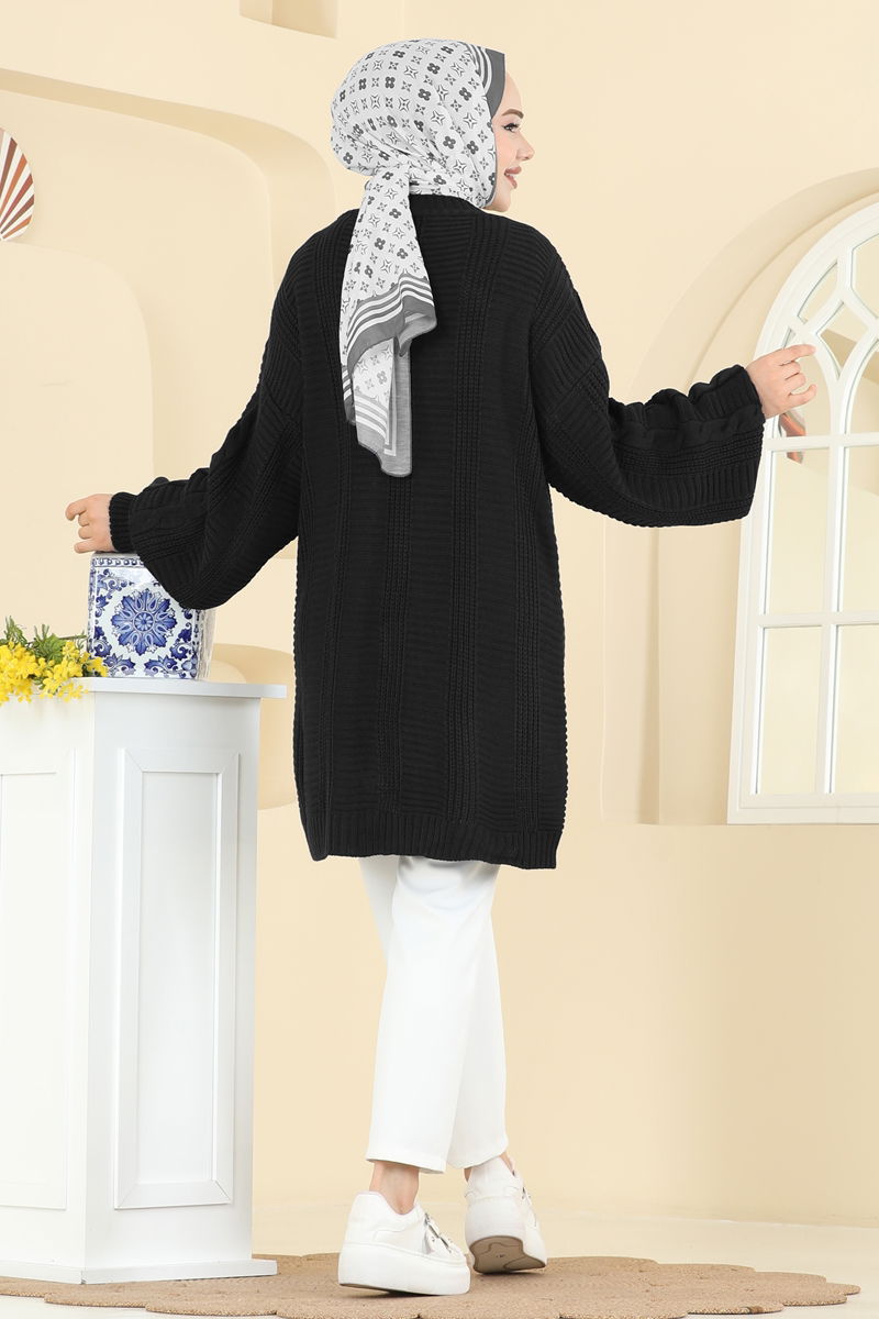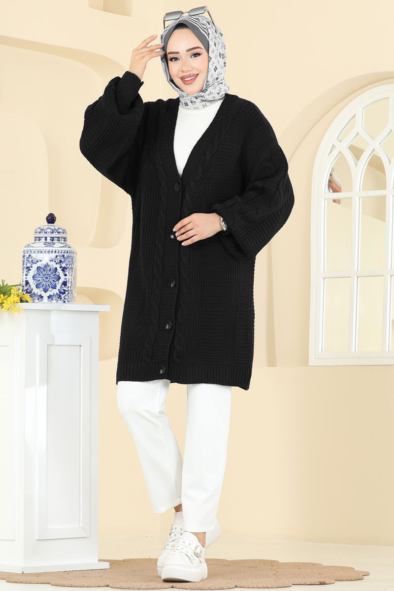 The Mid-Length Knitted Cardigan is an outerwear designed for modesty, perfect for autumn and winter. Easy to maintain with a gentle wash at 30 degrees, it's crafted from knitted fabric. Featuring a V-neckline and buttoned front for practicality, this cardigan is unlined, offering a light and comfortable experience. It fits standard sizes from 36 to 42.