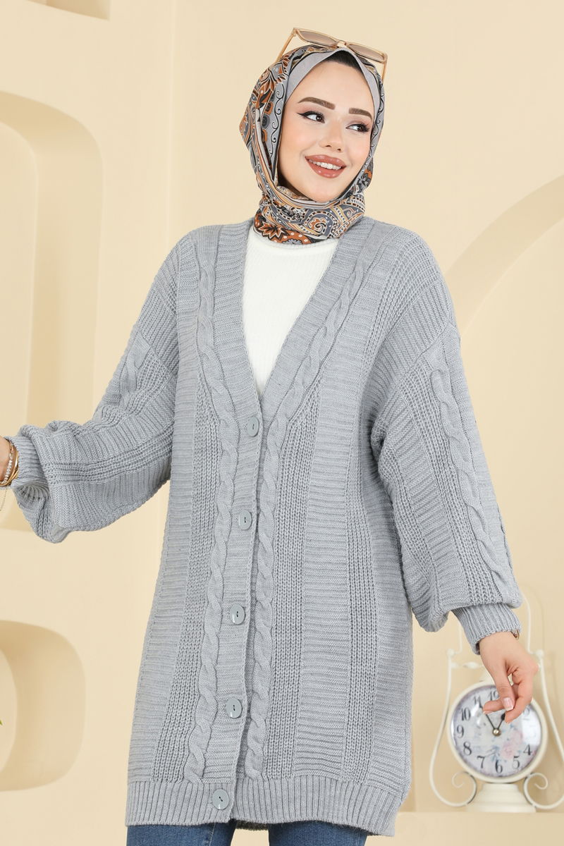 The Mid-Length Knitted Cardigan is an outerwear designed for modesty, perfect for autumn and winter. Easy to maintain with a gentle wash at 30 degrees, it's crafted from knitted fabric. Featuring a V-neckline and buttoned front for practicality, this cardigan is unlined, offering a light and comfortable experience. It fits standard sizes from 36 to 42.