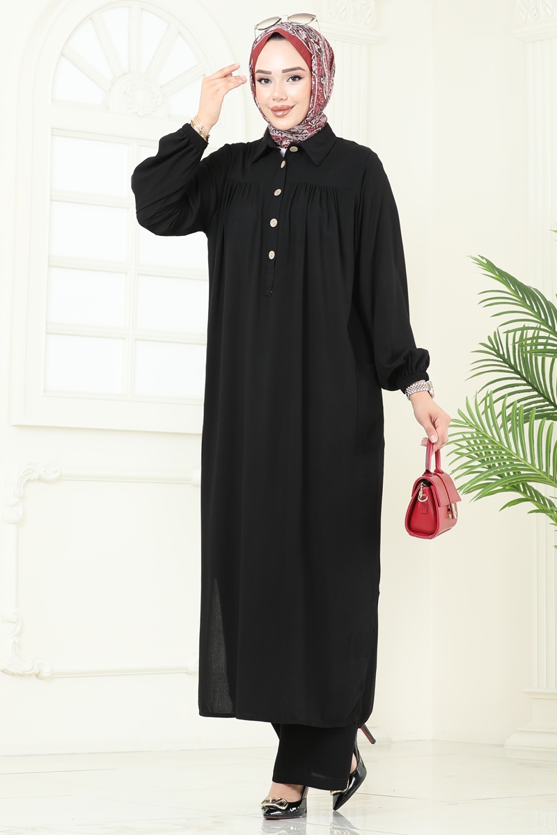 Ürün Detayları : Yeni sezonun tesettür modasına uygun tasarım. Gömlek yakalı ve ön kısımda yarım düğme detayları bulunmaktadır. Yandan yırtmaçlı tunik tasarımı, cep detayı ile işlevsellik katıyor. Pantolonun bel kısmı elastik özelliktedir. Manşetleri esnektir. Fotoğraf çekimleri nedeniyle üründe renk tonlarında farklılıklar oluşabilir.