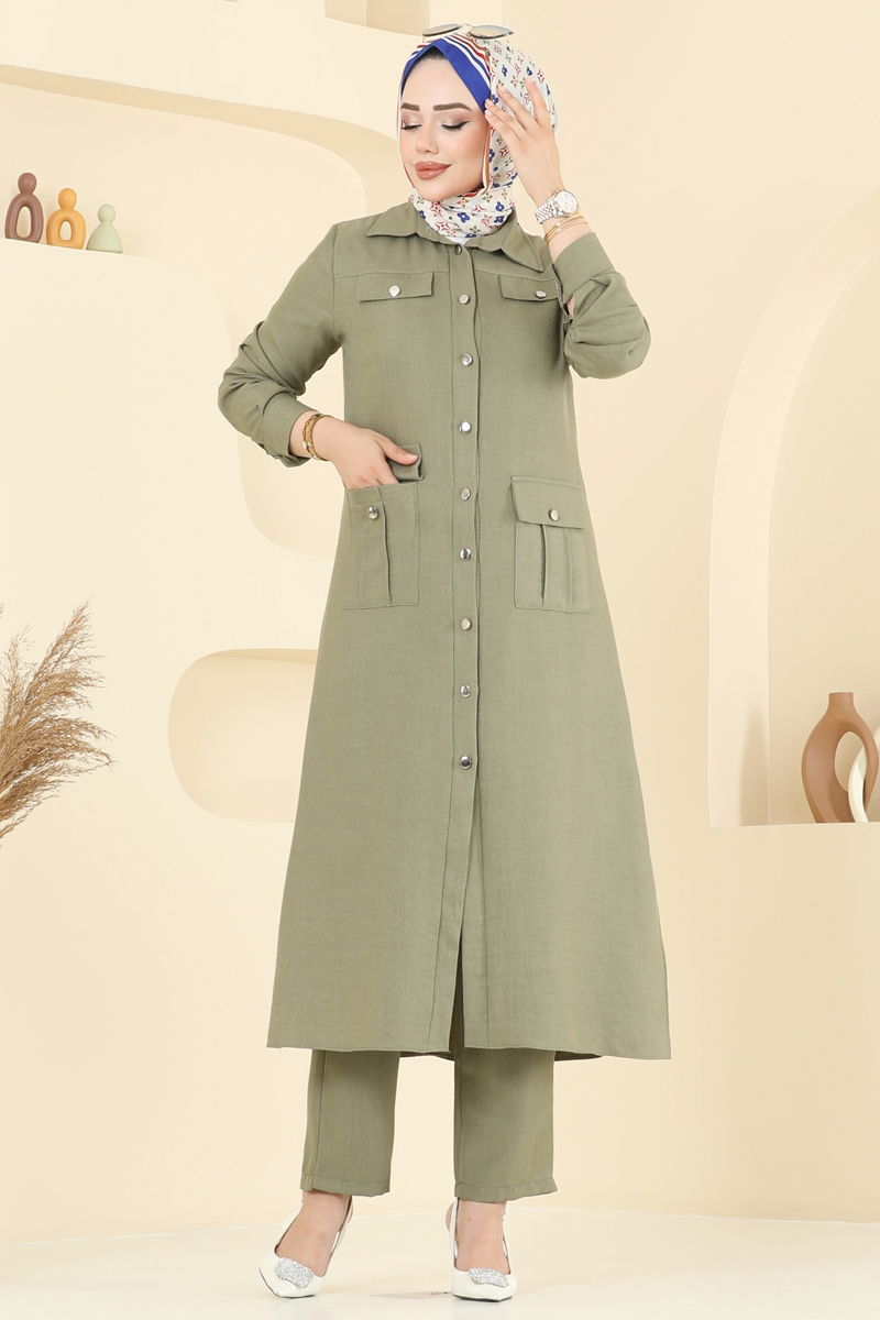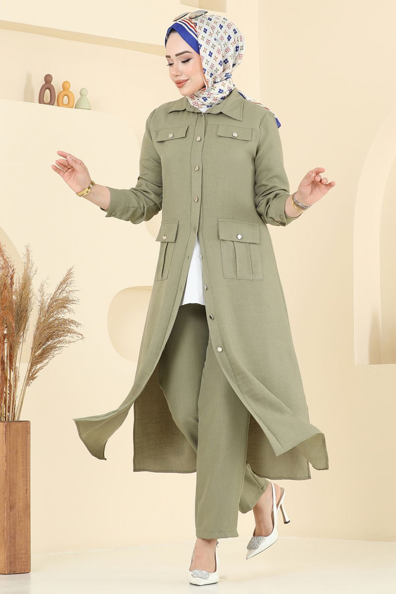 Ürün Özellikleri: Yeni sezon tesettür modasına ait bir üründür. Gömlek yaka tasarıma sahiptir. Önden düğmelidir. Tuniğin yanlarında yırtmaç detayı bulunur. Astarsızdır. Ceplidir. Pantolon beli lastiklidir. Manşet düğmeleri işlevseldir. Konsept çekimlerinden dolayı ürün renginde ton farklılıkları olabilir.