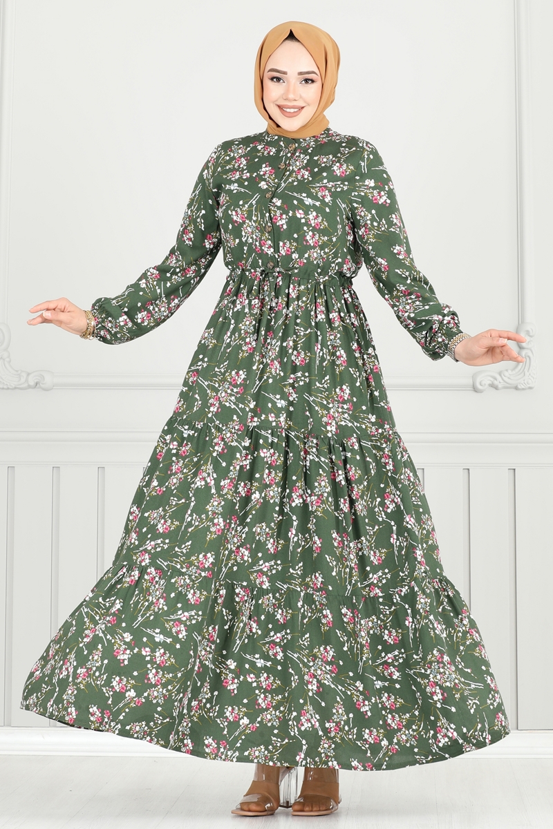 Çiçek Desen Tesettür Elbise 7122BG354-MS Haki
