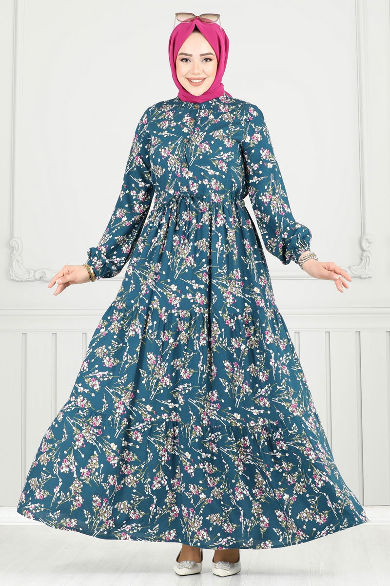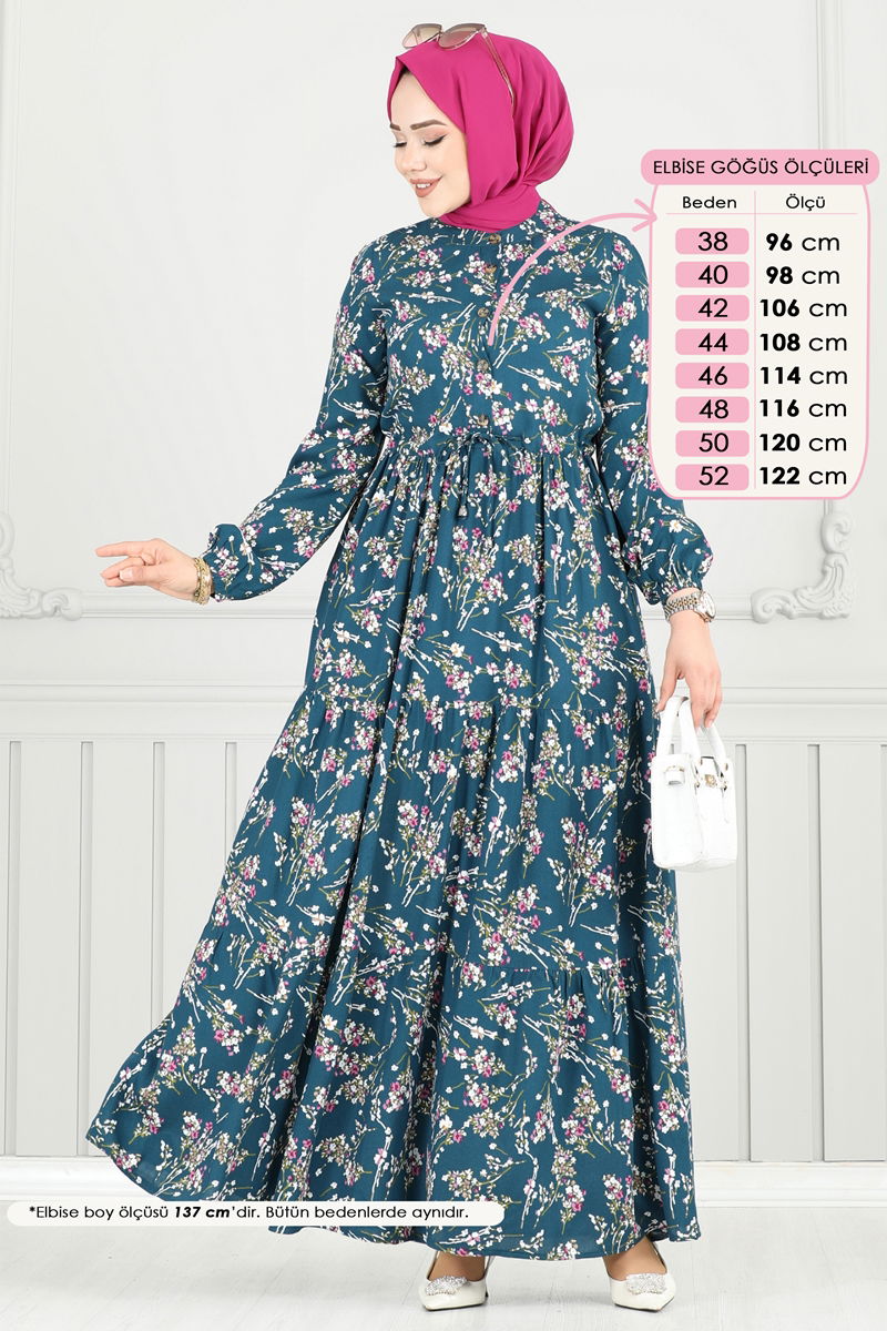 Çiçek Desen Tesettür Elbise 7122BG354-MS Petrol