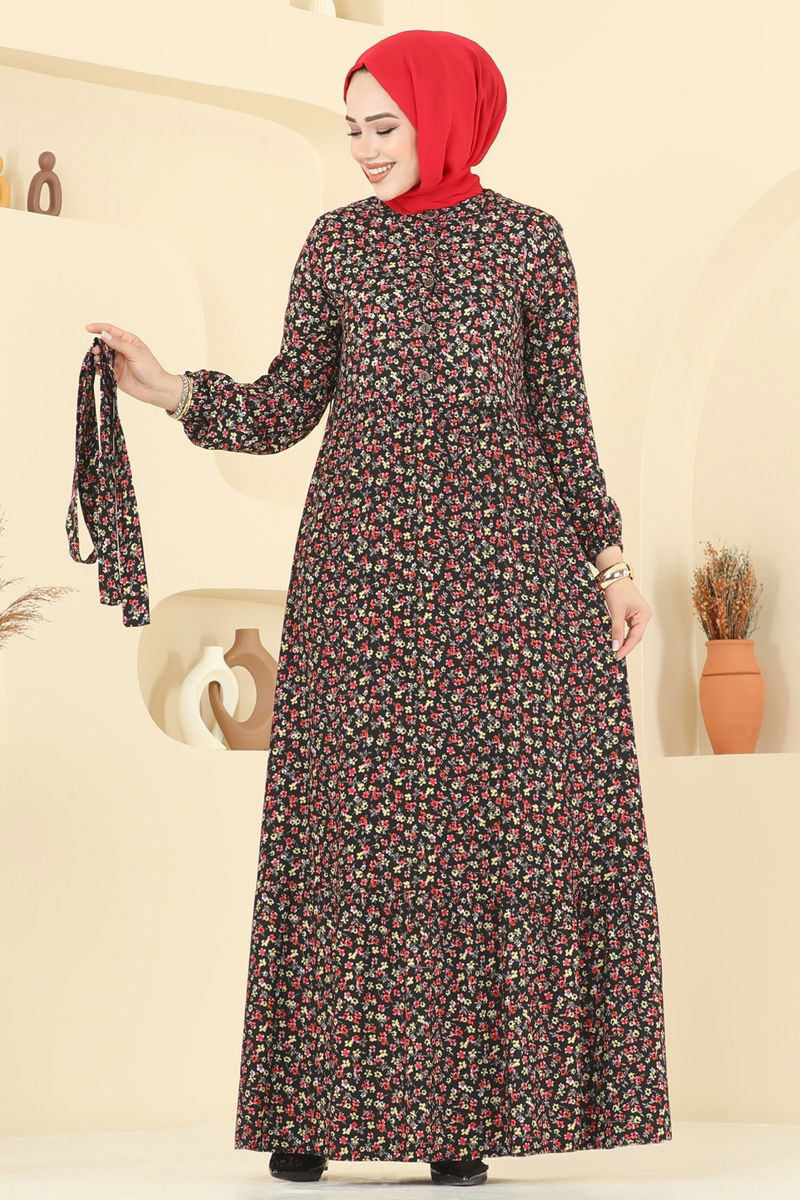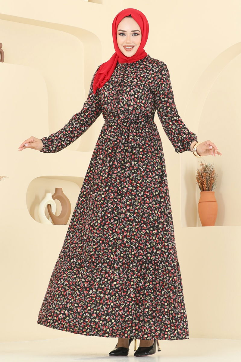Çiçek Desenli Viskon Elbise 5002ERK1158-MS Siyah
