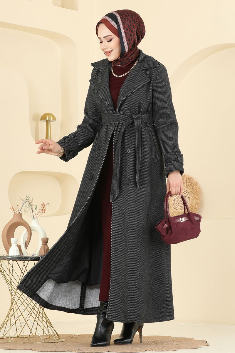 The Striped Pattern Wool Coat is a fall and winter essential, bringing a stylish flair to modest fashion. Washable at 30 degrees on a delicate cycle, this coat features a double-breasted design and button-front closure that catch the eye. Its lined structure ensures comfort, while the adjustable belt-cuffed sleeves offer customizable wear. The coat's belt detail not only looks elegant but can also be removed optionally. The fixed ends of the belt prevent it from waving, while the middle part remains stitch-free, adding a refined touch. Practical pockets provide great convenience for everyday use.