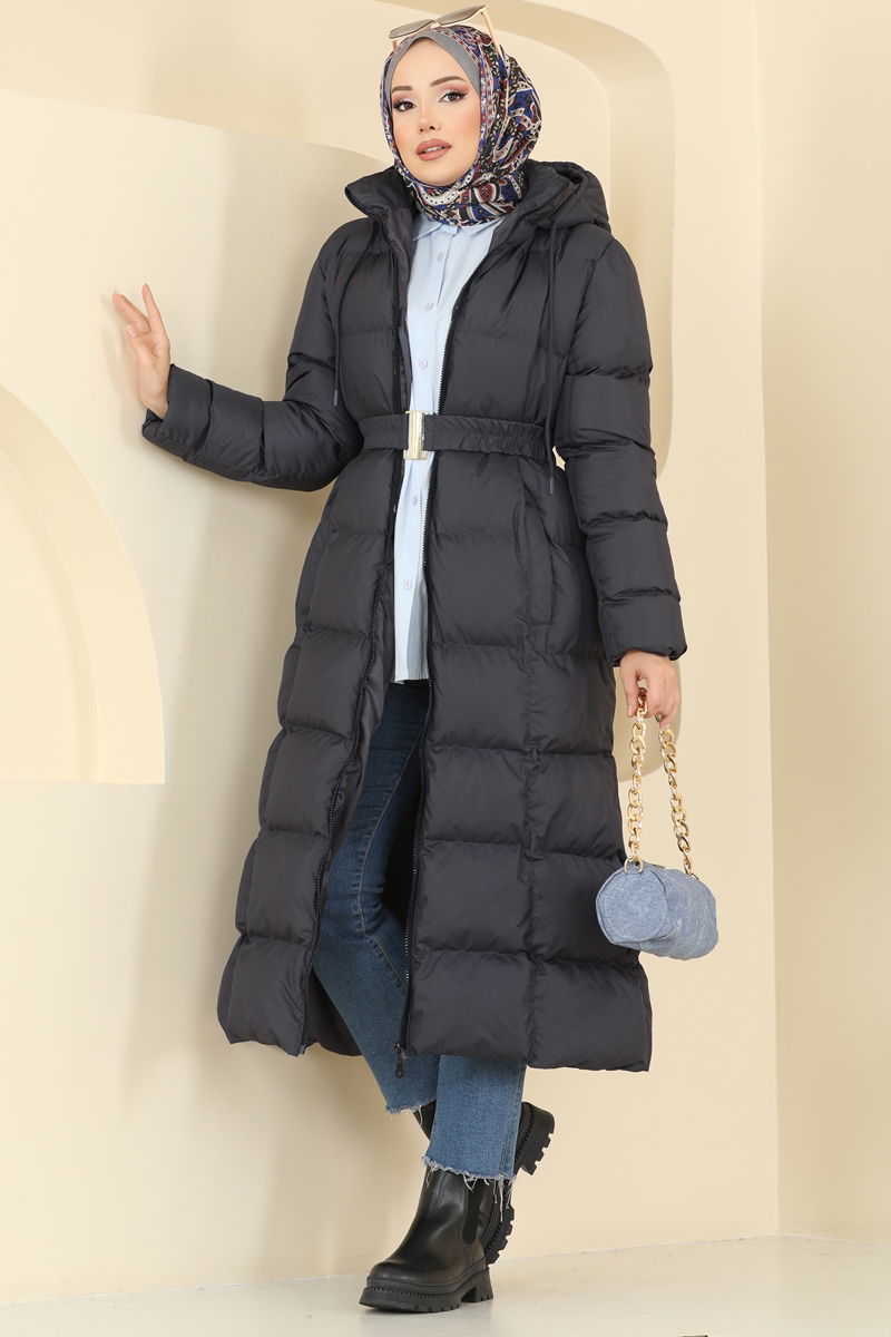 The Hooded Collar Puffed Coat is specially designed for modest wear. Designed to keep you warm in autumn and winter, this coat can be washed at 30 degrees on a delicate cycle. Made from high-quality Jesika fabric, this product features a lining and a front zipper. Its fixed belt and handy pocket enhance its elegance. The product shown on the model is size 38.