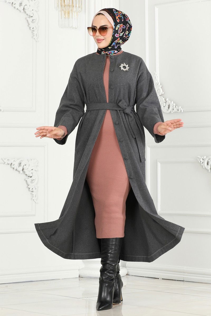 Front Buttoned Coat model is a modest fashion item. Suitable for winter season. Only dry cleaning is recommended. Made of first-class Cashmere fabric. The coat has a Bicycle collar and front buttons. It is unlined. (The product on the model is size 38.) It has pockets.