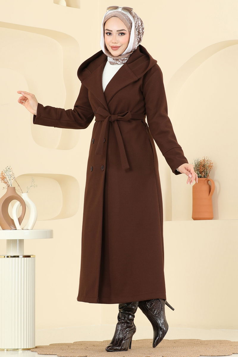 Product Feature : It is a new season hijab fashion product. There is a hidden pocket in the product. The product has a Double-breasted collar. The product has From the front buttons. It is lined. The hood is sewn to the product. Belt included, optional not available. There may be a tonal difference in the product due to concept photo shoots.