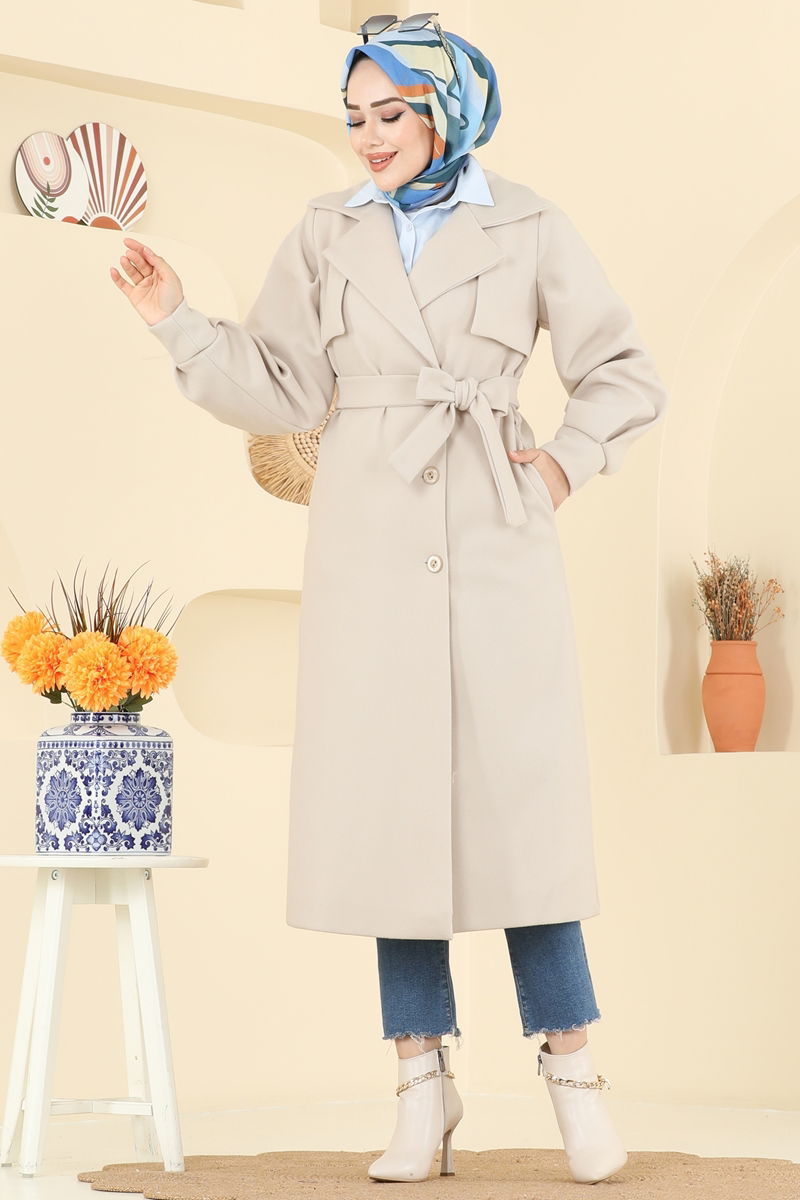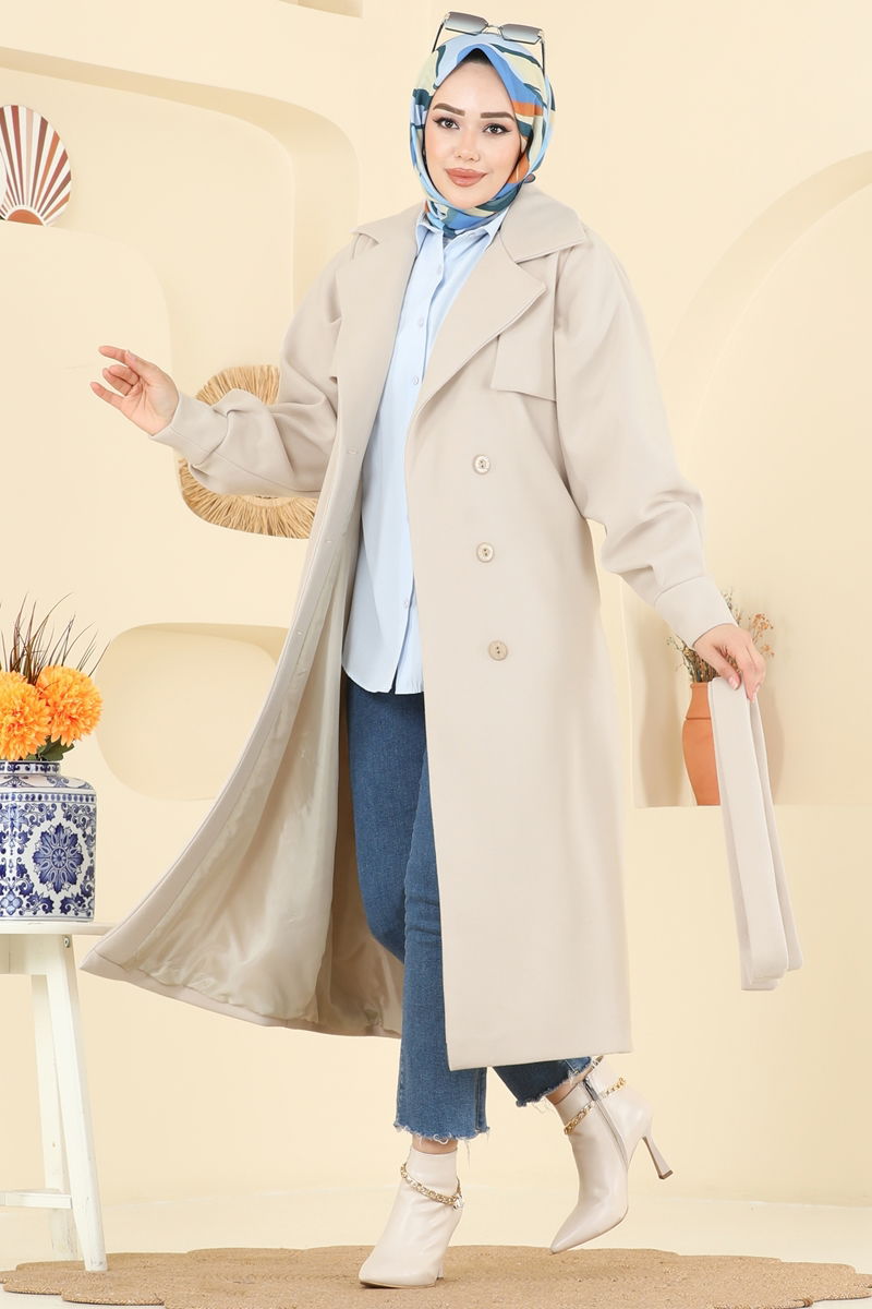 Product Feature : It is a new season hijab fashion product. The product has a Double-breasted collar. The product has From the front buttons. It is lined. Belt included, optional not available. Accessories are not included. Pocket available. There may be a tonal difference in the product due to concept photo shoots.