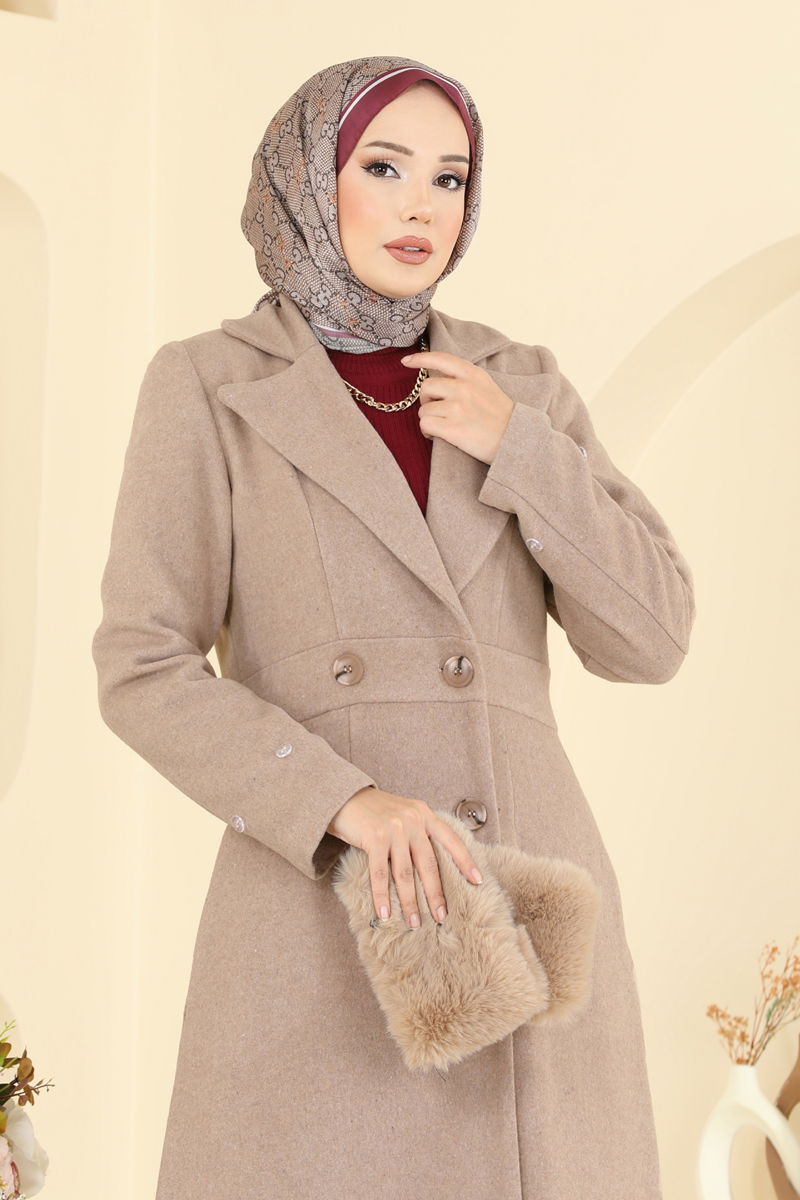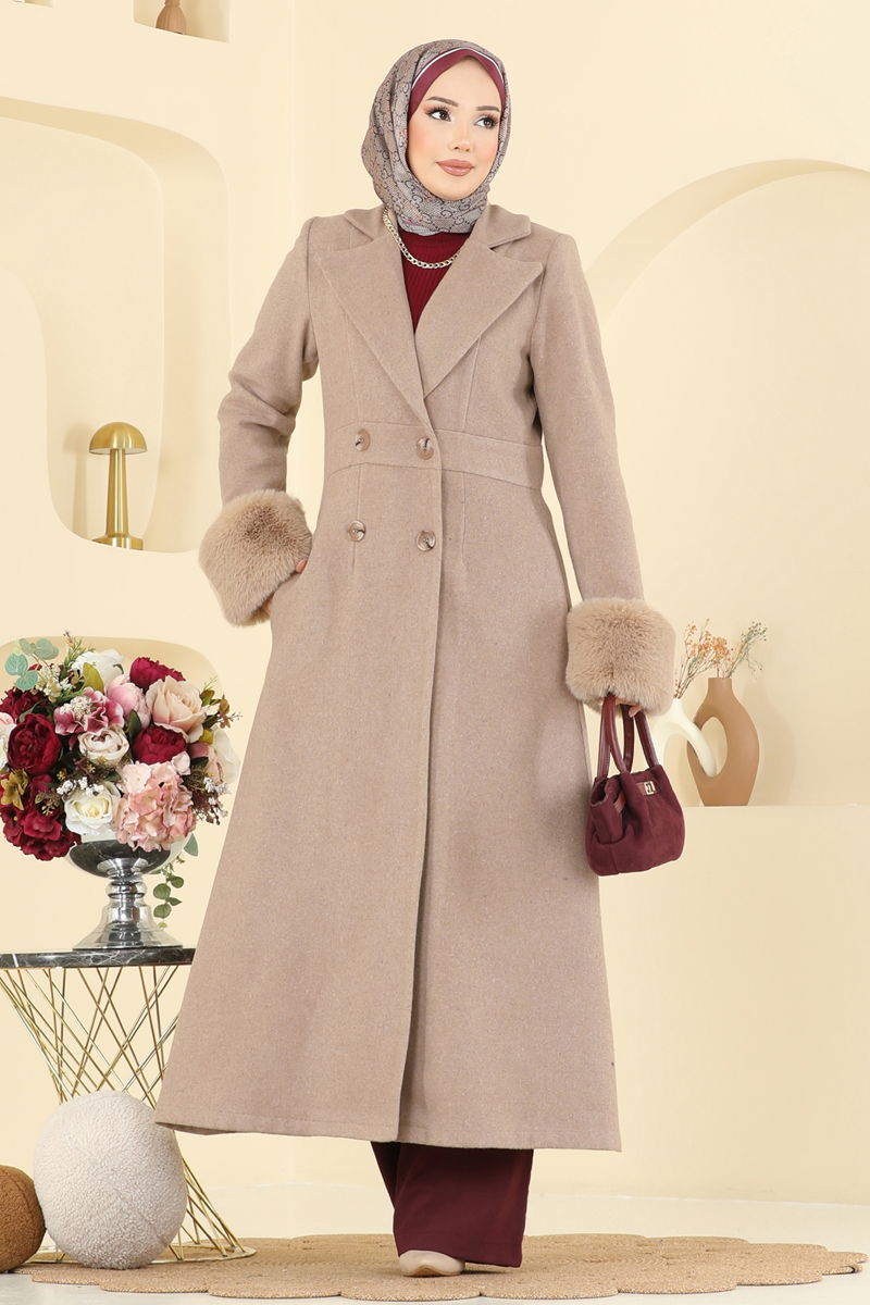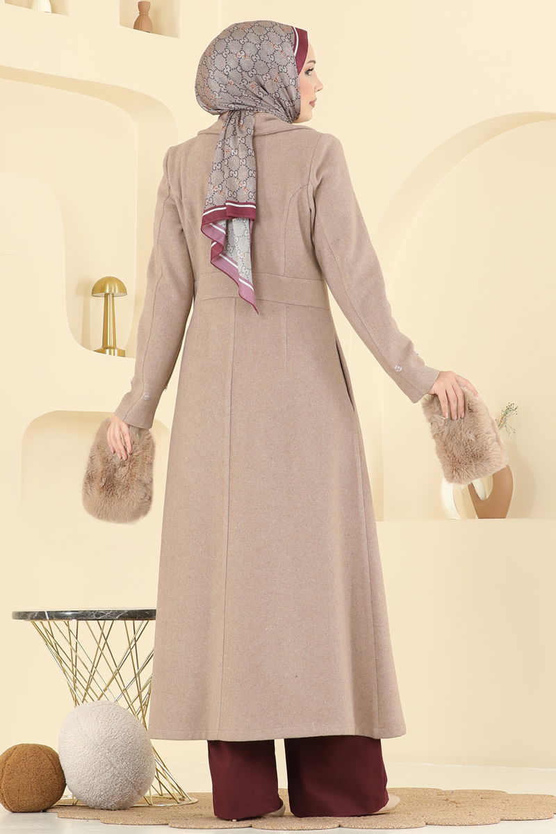 The Cuffed Fur-Detailed Coat is an elegant outerwear choice for the autumn and winter seasons. This modest coat features distinctive fur details on the cuffs that can be detached according to preference. Made from cashmere fabric, it offers a no-lining design with a jacket collar and can be washed gently at 30 degrees Celsius. It features practical pockets for everyday use, and the showcased model is in size 38.