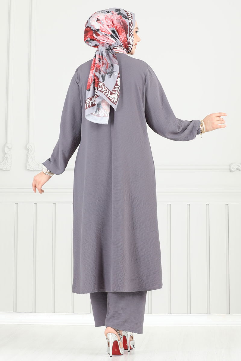The Slit Buttoned Hijab Suit is suitable for all-season use. Offering a gentle wash at 30 degrees, this suit is made from lightweight and breathable Aerobin fabric. It features a bicycle neck and half-button design for practical use. The elastic waistband of the pants ensures a comfortable fit. The slit button design adds a stylish touch to the elegance. Together with its tunic and pants, this suit offers both comfort and elegance in daily wear.