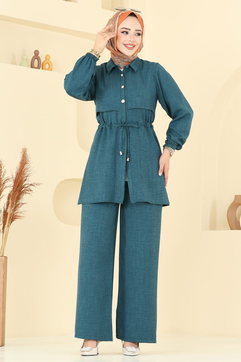 The Belted Tunnel Sofia Set is an excellent choice for stylish hijab apparel, suitable for wearing all seasons. It should be washed gently at 30 degrees Celsius. Made from linen fabric, this set features a shirt collar and front-button design that offers a modern and chic appearance. The product is unlined and the cuffs are elasticized. Comprised of a tunic and trousers, this ensemble is perfect for both meetings and everyday wear. Note that the blouse is not included; it is styled with the set only for visual purposes. The trousers have an elastic waist, providing maximum comfort.