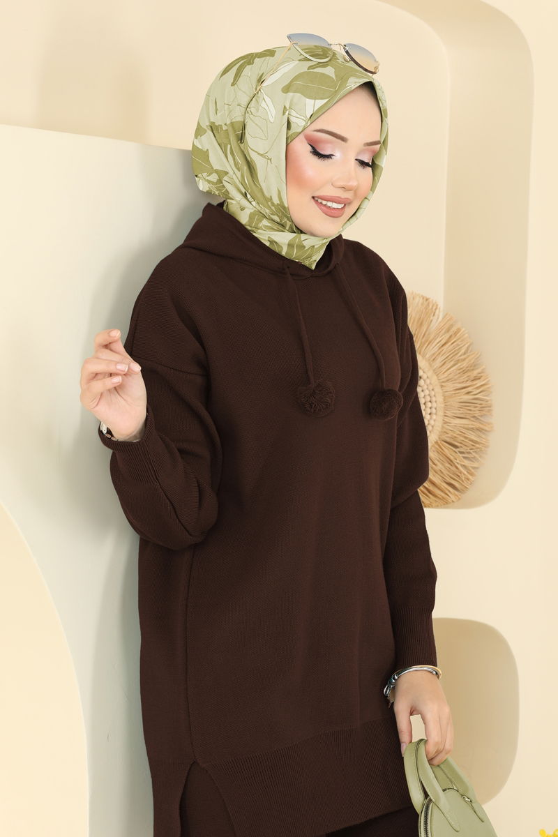 Our hoodie detailed knit set is a perfect choice for your autumn and winter seasons! Offering comfort and style with its design, this set is made from knit fabric and is unlined but does not show through. This modest fashion-friendly outfit is indispensable for every wardrobe. It is standard sized and includes a tunic and trousers.