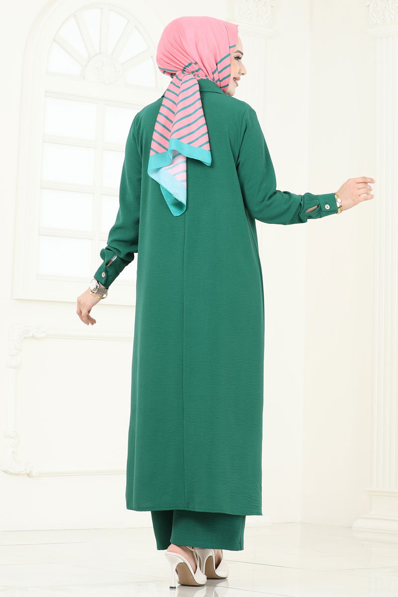 The Front-Buttoned Aerobin Set is designed to bring the elegance of modest fashion to all four seasons. Washable at 30 degrees with its sensitive touch, this outfit provides comfort throughout the day with its soft Aerobin fabric. Featuring a shirt collar and a side-slit tunic for a modern look, and elastic waist pants for enhanced comfort, it's perfect for those seeking coziness and elegance in every setting. The active buttons on the cuffs complete the chic appearance.