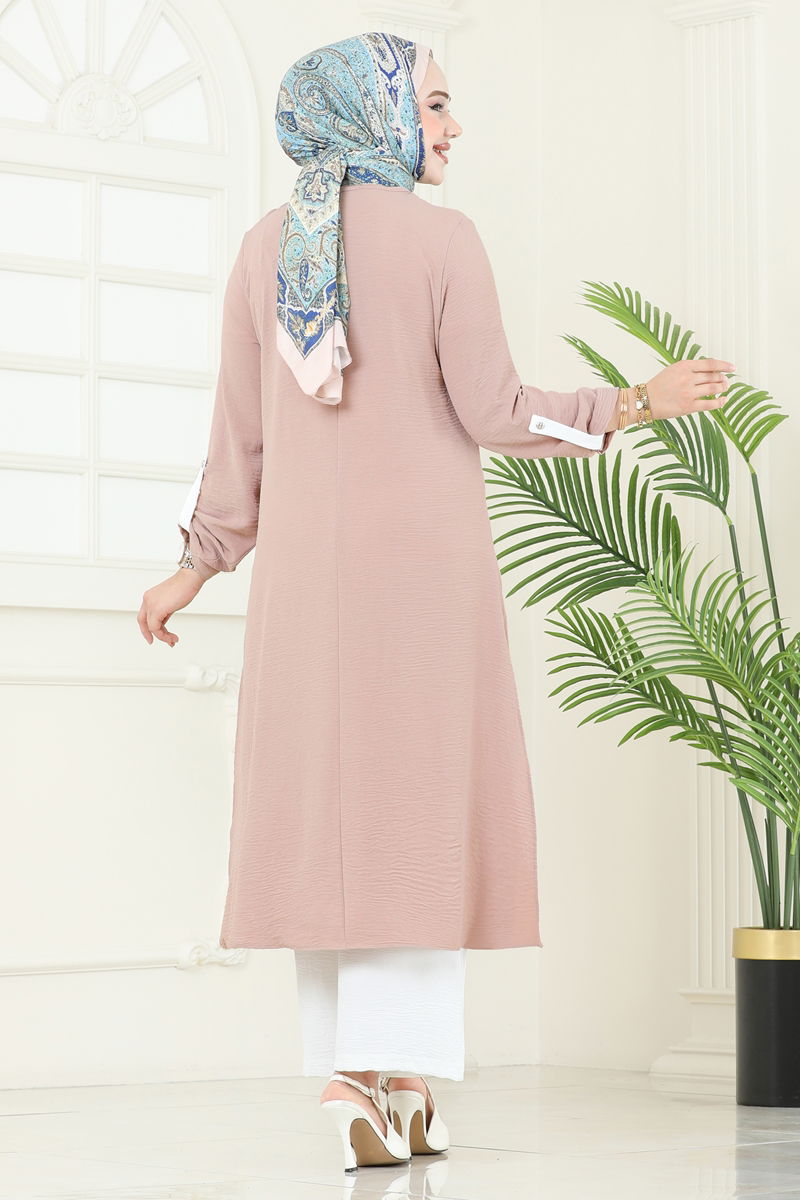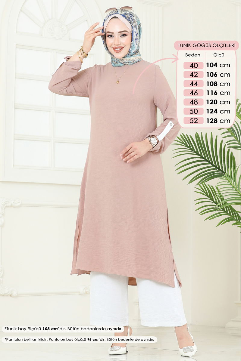 Product Feature : It is a new season hijab fashion product. The product is worn on the head. The product has a Cycling collar. The tunic has a side slash.. Unlined. Accessories are not included. The waist of the trousers is elastic. Cuff buttons are active. There may be a tonal difference in the product due to concept photo shoots.