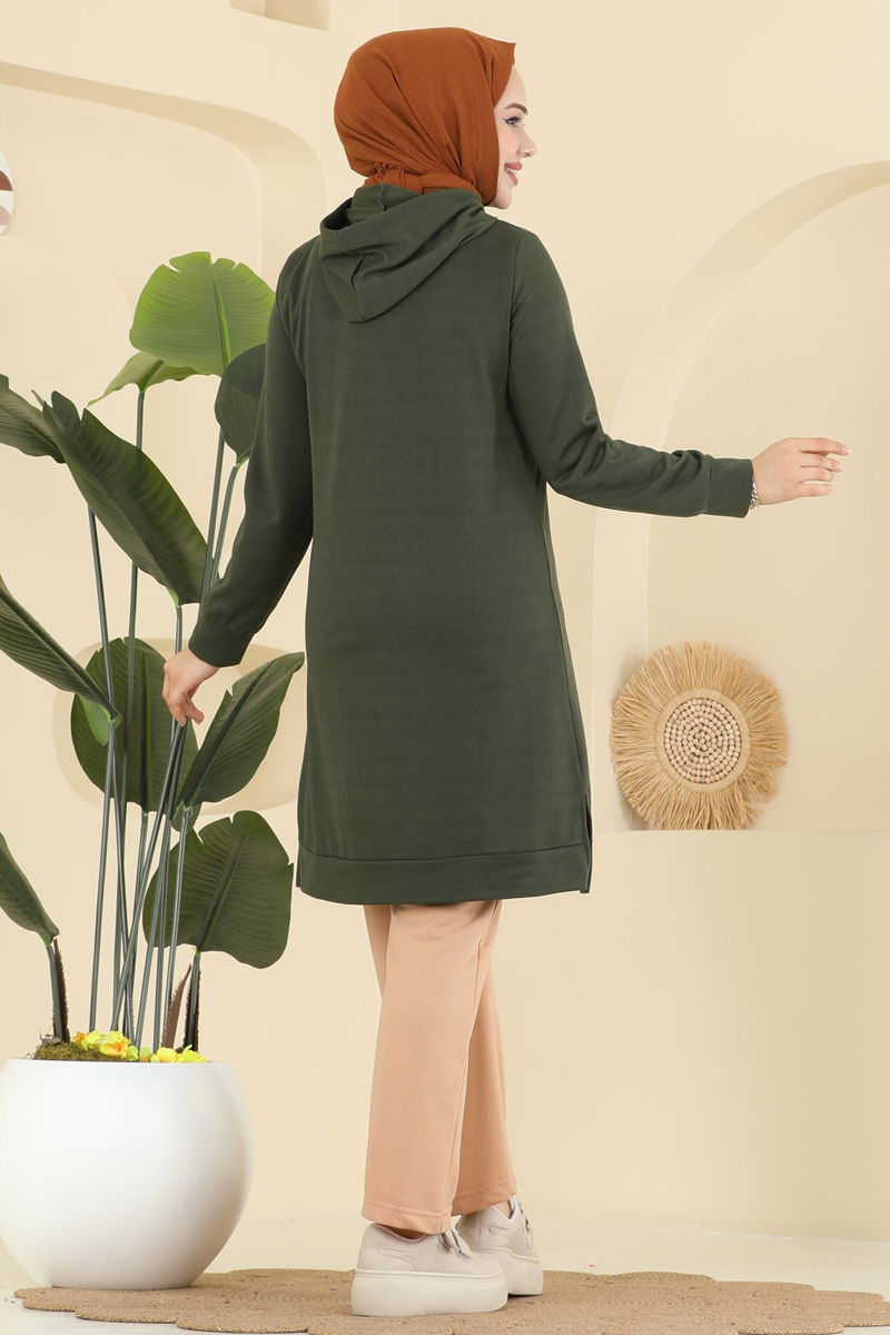 Product Feature : It is a new season hijab fashion product. The neck drawstring is active. The product has a Hooded collar. The tunic has a side slash.. Unlined. The writings are in print. The hood is sewn to the product. The waist of the trousers is elastic. The cuff is rubberized. There may be a tonal difference in the product due to concept photo shoots.