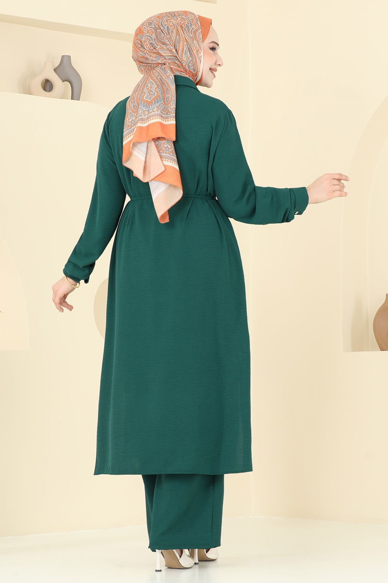 The Side-slit Suit model merges modest fashion with modern lines suitable for all-year-round use. Washing at 30 degrees on a delicate cycle, this suit is made from aerobin fabric offering comfort. With a shirt collar and hidden buttons, the tunic adds elegance with its side-slit design. The tunics straight-cut belt is sewn at both ends and can be optionally removed. The pants feature an elastic waistband and both pieces include active cuff buttons.