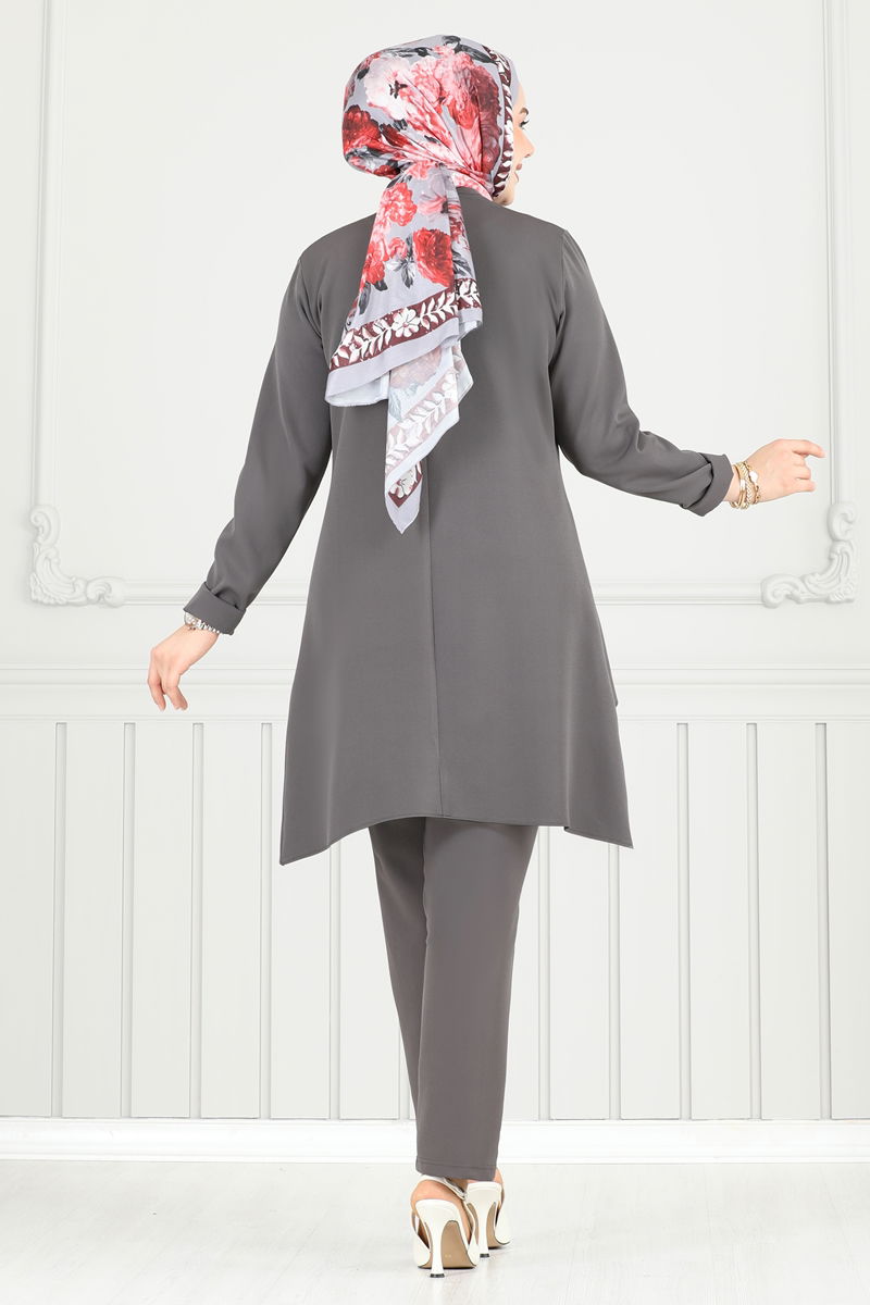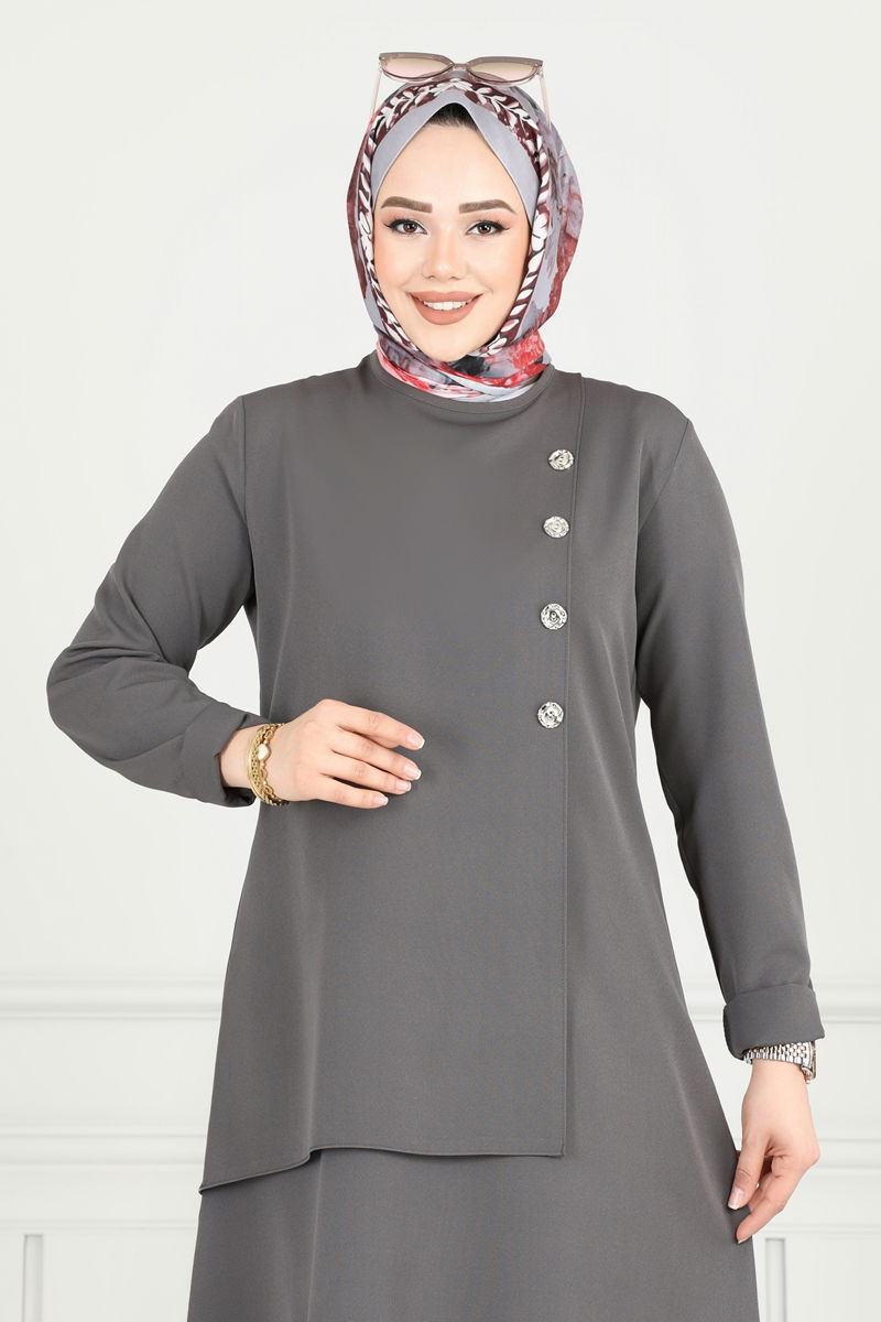 The Accessory Buttoned Hijab Suit is a chic option for all seasons. It offers practical use with its feature of being washable at 30 degrees with delicate wash. Made from Dabil fabric, this suit provides comfortable wear with its bicycle collar design and lining-free structure. Its zipper at the back makes it easy to wear and take off. Designed as a tunic and trousers, this model offers a comfortable fit with the elastic at the waist of the trousers. The buttons are added as decorative details only. The product on the model is size 40.