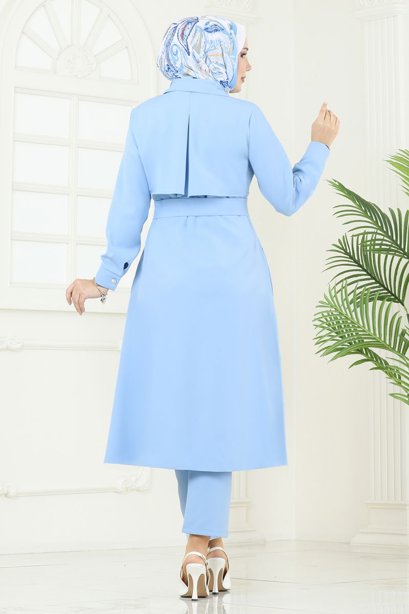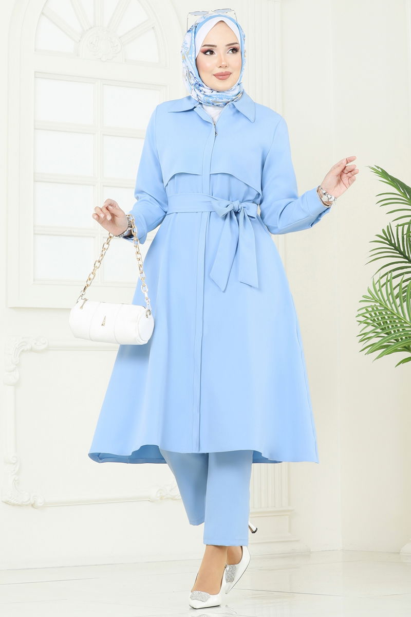 Product Feature : It is a new season hijab fashion product. The product has a Shirt collar. Unlined. The product has a zipper at the From the front part. Belt included, optional not available. The waist of the trousers is elastic. Cuff buttons are active. There may be a tonal difference in the product due to concept photo shoots.