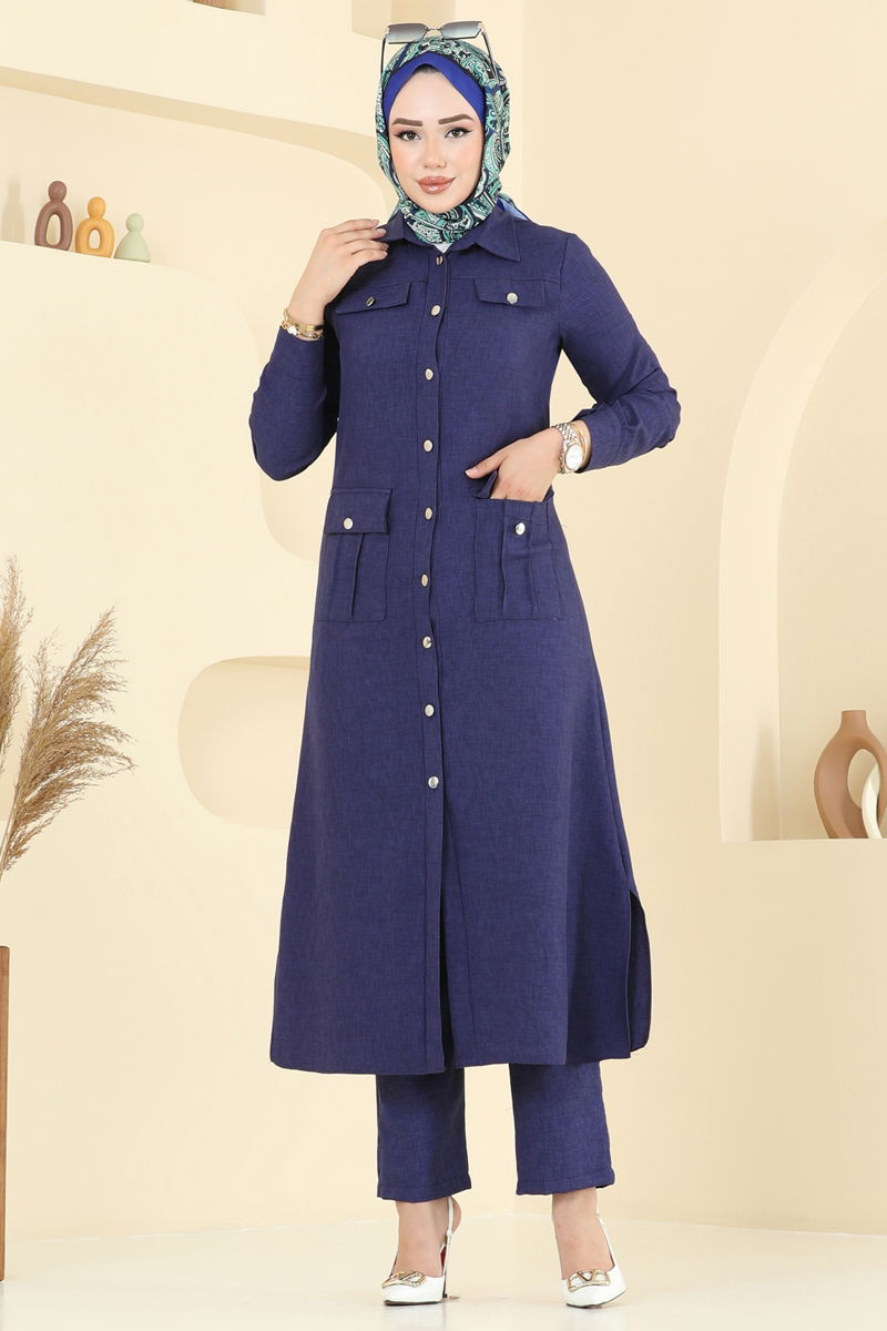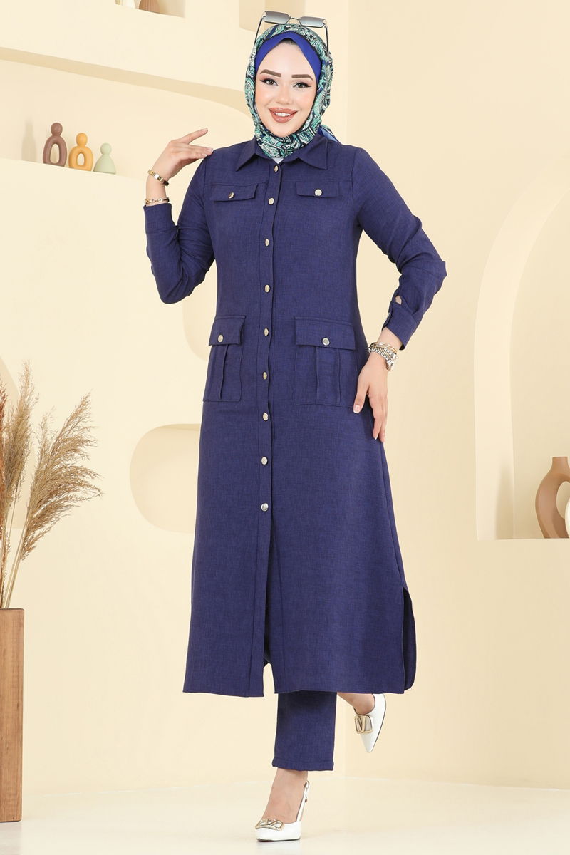The Pocket-Detailed Sofia Set offers a modern and stylish look with its modest cut. Suitable for all seasons, this set is made from sofia linen fabric. Its shirt collar design and front buttoned structure provide practical use. Side slits on the tunic offer freedom of movement, while the elastic waist on the pants increases comfort. Pockets in both the tunic and pants add useful details. Active buttons on the cuffs complete the elegance. The product can be washed at 30 degrees on a gentle cycle.
