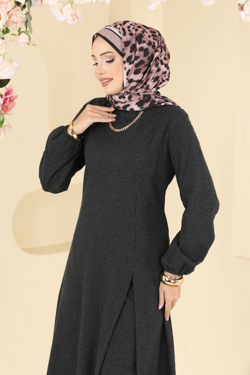 The Slit Detailed Herringbone Suit KOMBİN offers an ideal choice for women who embrace the modest dressing style. Suitable for autumn and winter, this product can be washed at 30 degrees due to its delicate fabric structure. Made from herringbone patterned fabric, this suit provides both style and comfort. The bicycle neck tunic with a front slit detail offers a modern look, while the elastic waist pants promise comfort throughout the day. Additionally, the elastic cuffs make it practical to wear. The tunic is unlined, and the product on the model is size 38. The suit is worn over the head and both pieces are very comfortable in design.