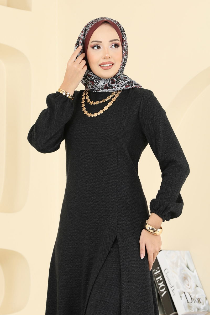 The Slit Detailed Herringbone Suit KOMBİN offers an ideal choice for women who embrace the modest dressing style. Suitable for autumn and winter, this product can be washed at 30 degrees due to its delicate fabric structure. Made from herringbone patterned fabric, this suit provides both style and comfort. The bicycle neck tunic with a front slit detail offers a modern look, while the elastic waist pants promise comfort throughout the day. Additionally, the elastic cuffs make it practical to wear. The tunic is unlined, and the product on the model is size 38. The suit is worn over the head and both pieces are very comfortable in design.