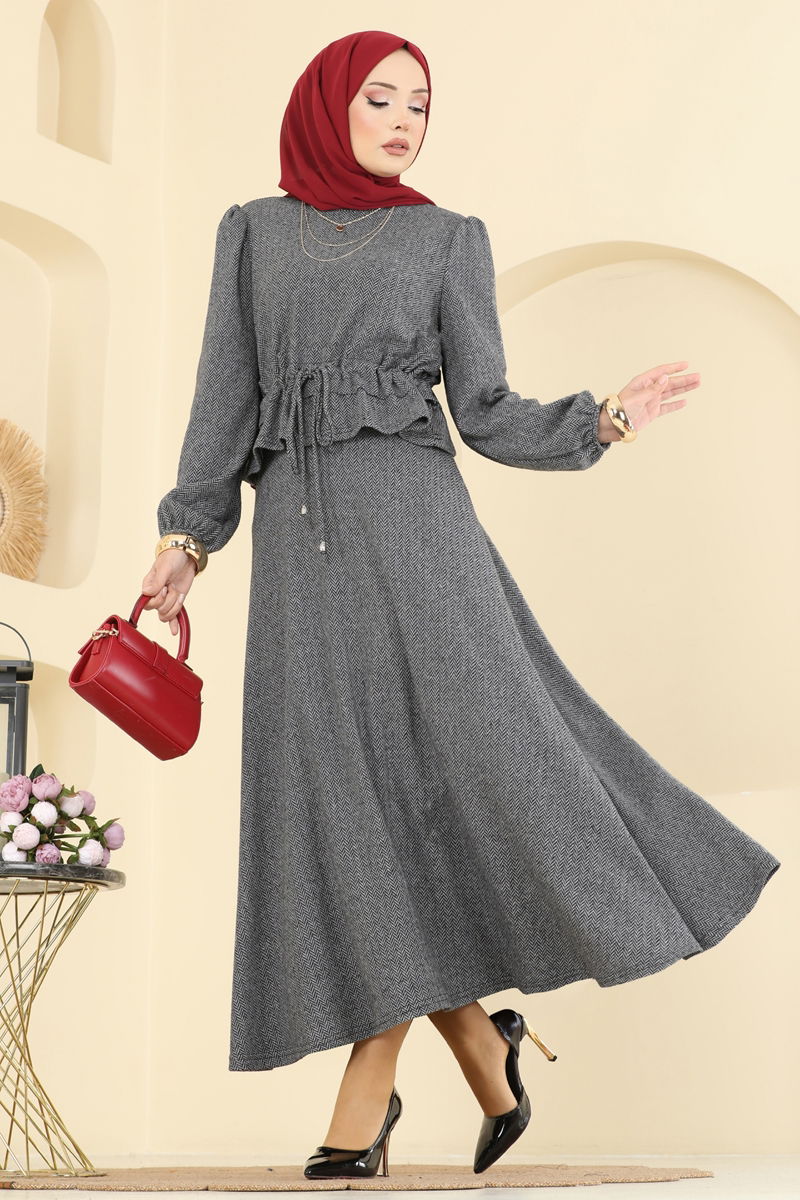 Perfect for the Autumn and Winter seasons, this Elastic Cuffed Herringbone Suit is an ideal choice for veiled women. Recommended to be washed gently at 30 degrees to maintain its shape for a long time, this outfit features a bicycle neck and an unlined design for a modern look, while the drawstring waist skirt combined with a zippered waist offers both comfort and elegance.