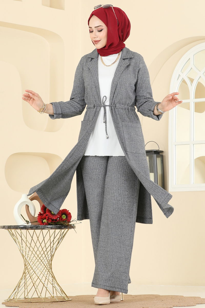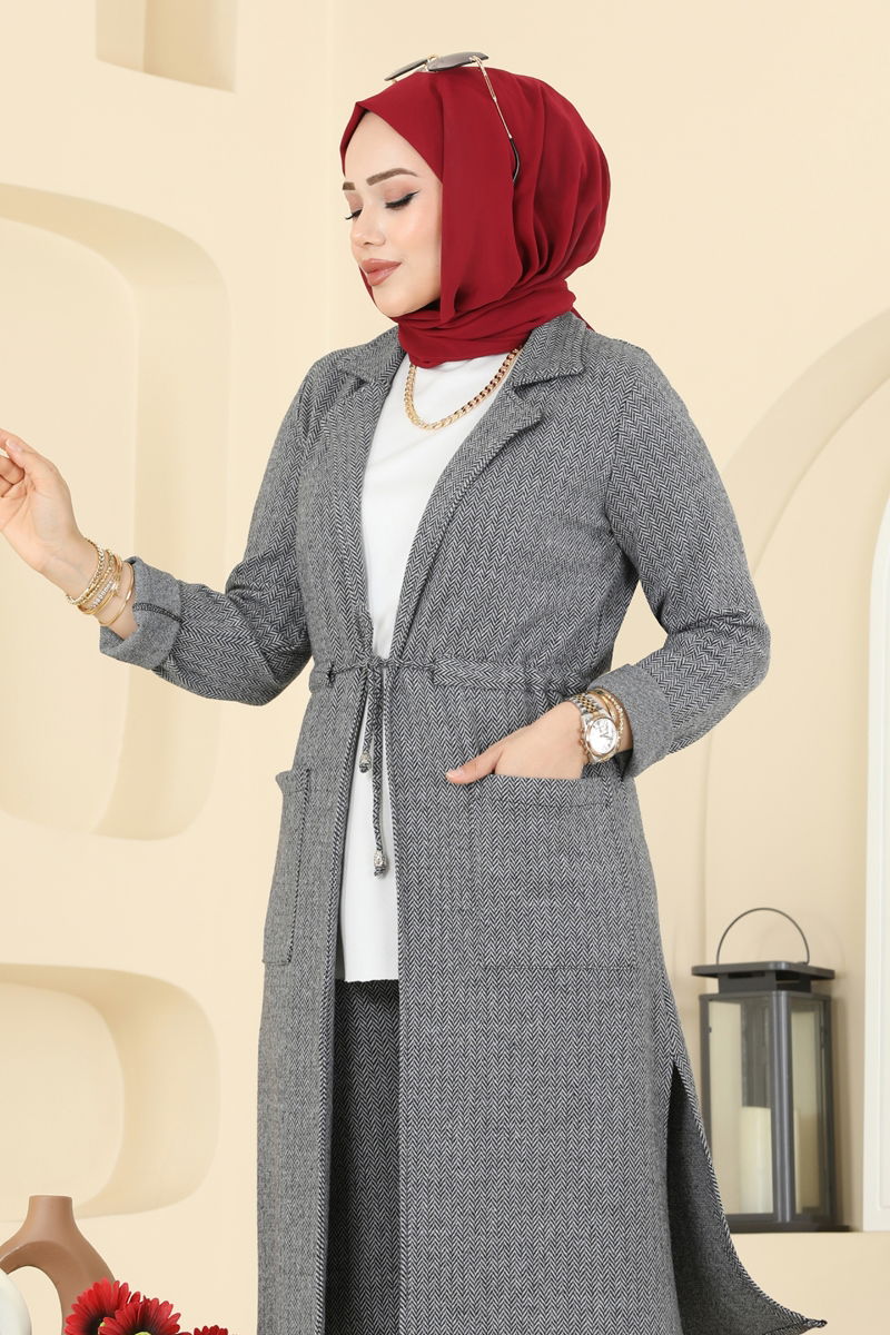 This elegant and modern Belt Tunnels Herringbone Suit COMBINE is a perfect addition to your modest wear collection. Ideal for autumn and winter, this piece offers both comfort and style with its delicate fabric that can be washed at 30 degrees. The herringbone patterned fabric stands out with its double-breasted collar detail and unlined structure, while the tied waist and elastic waistband of the pants provide all-day comfort. Both the jacket and pants feature pockets, adding functionality.