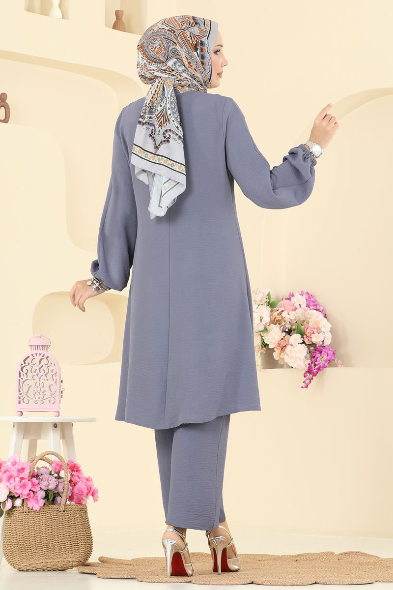 The Accessory Buttoned Aerobin Set is a modest fashion ensemble suitable for all seasons. You can wash it gently at 30 degrees. Made from aerobin fabric, it offers comfort throughout the day with its breathable material. Its bicycle neck design and unlined structure provide a modern look. The tunic and pants feature elastic cuffs and an elastic waistband ensuring a perfect fit. The buttons added as accessories complete the elegance.