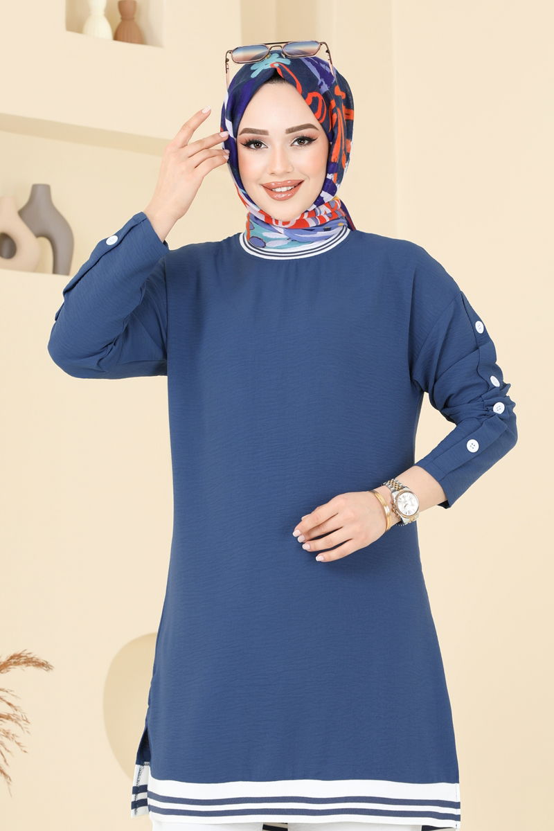 Our Accessorized Suit Combination model is specially designed for ladies who prefer modest apparel. Made from Aerobin fabric, this product can be used comfortably across all seasons. The tunic features a bike neck and chic side slits that provide a modern look, while the elastic waistband of the pants offers maximum comfort. The buttons function merely as accessories, and this piece can be washed at 30 degrees on a gentle cycle. The product shown on the model is size 38.