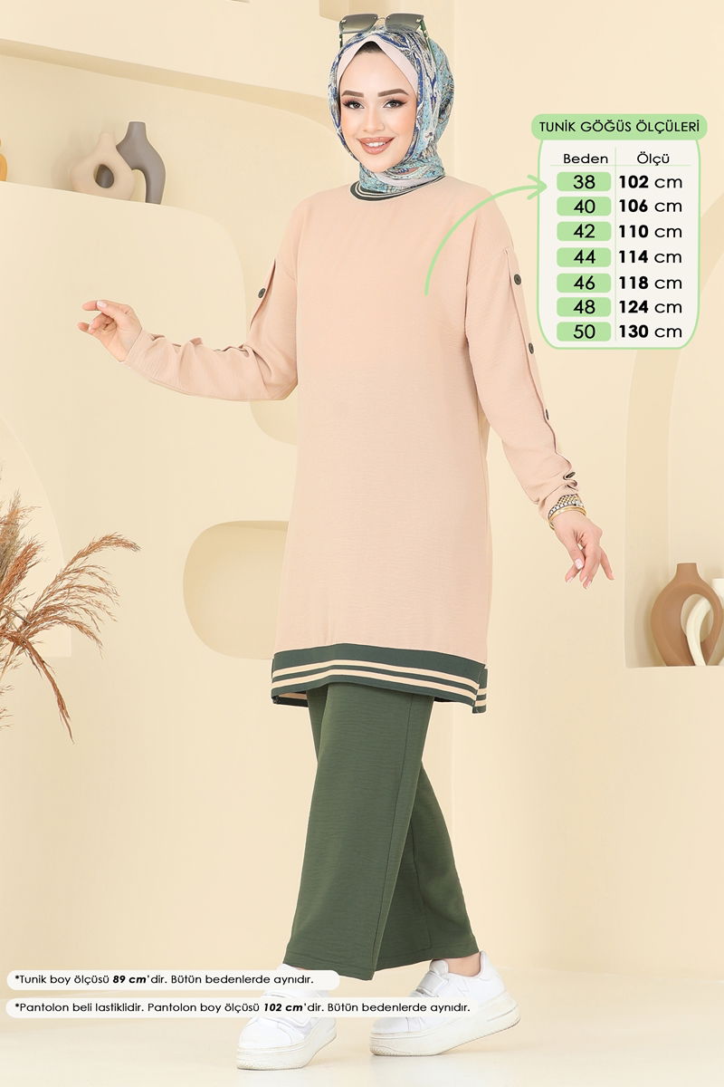 Our Accessorized Suit Combination model is specially designed for ladies who prefer modest apparel. Made from Aerobin fabric, this product can be used comfortably across all seasons. The tunic features a bike neck and chic side slits that provide a modern look, while the elastic waistband of the pants offers maximum comfort. The buttons function merely as accessories, and this piece can be washed at 30 degrees on a gentle cycle. The product shown on the model is size 38.