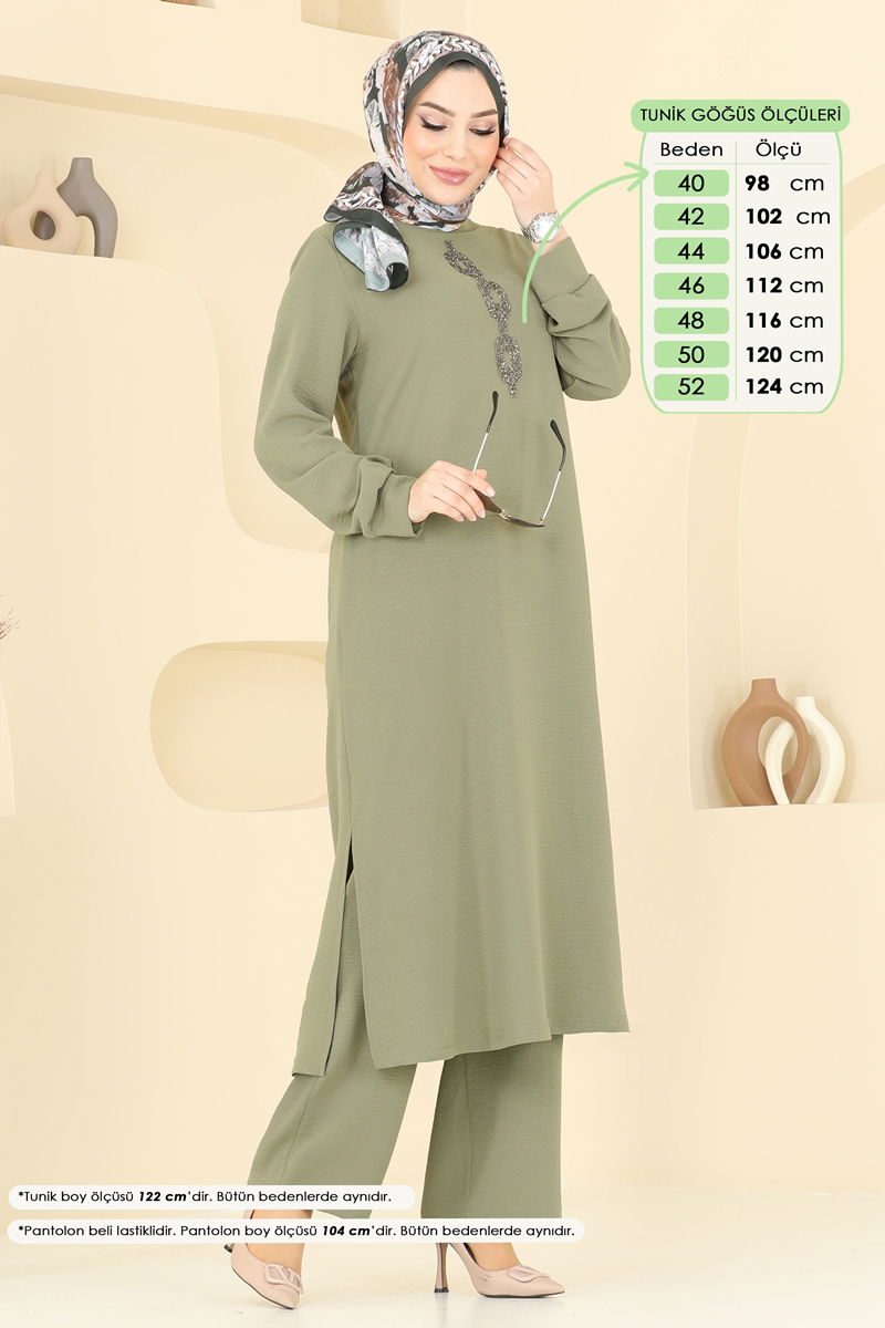 Product Feature : It is a new season hijab fashion product. It has a button that can be used from the back. The product has a Cycling collar. The tunic has a side slash.. Unlined. The stones are glued. The waist of the trousers is elastic. There may be a tonal difference in the product due to concept photo shoots.