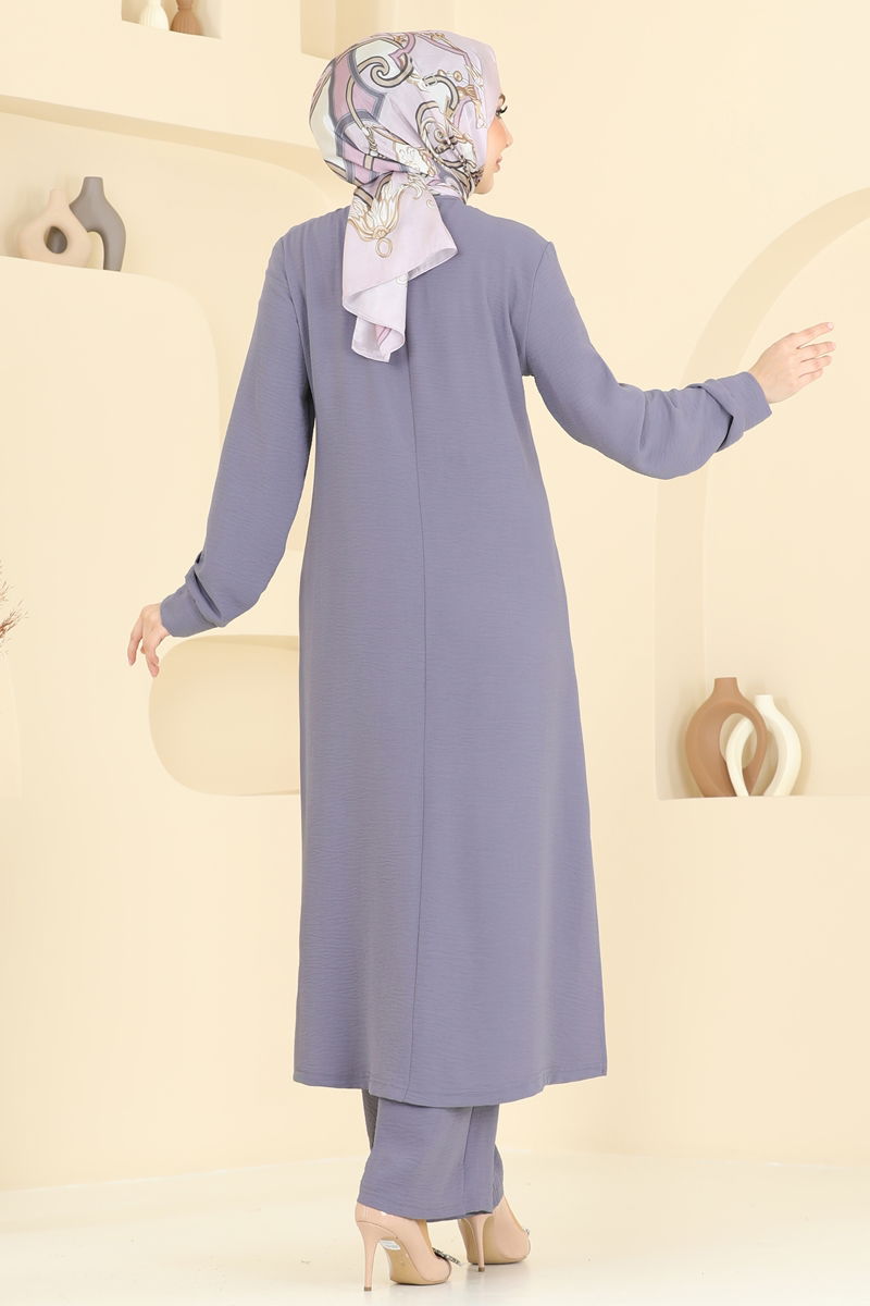 The Embellished Front Aerobin Set is a modest wear suitable for all seasons. Made from lightweight and breathable aerobin fabric, it offers both comfort and style. The tunic features side slits and a bicycle neckline, and is unlined for maximal comfort. The waist of the trousers is elasticated for all-day ease. The set is adorned with stone details which are affixed by gluing. It can be easily worn and taken off with a button at the back. The product is suitable for gentle washing at 30 degrees.