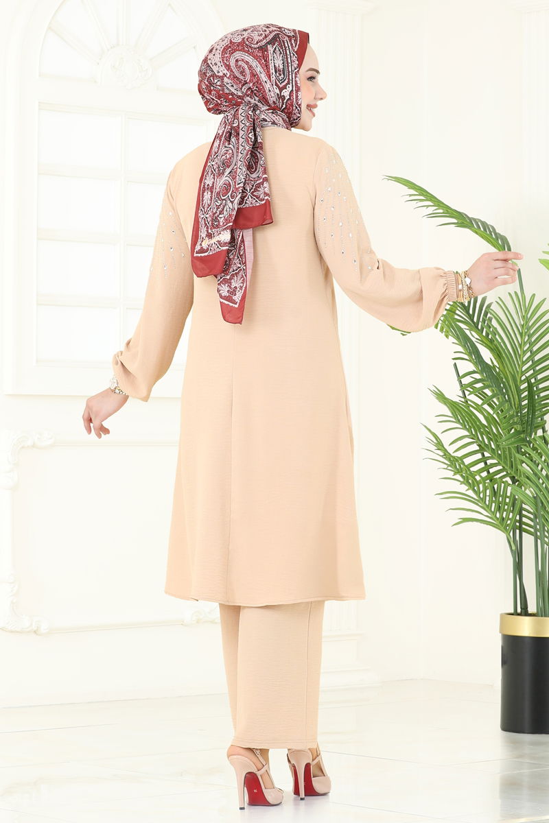 Shine in the Stone Detail Set This hijab set brings together elegance with its expanded bicycle neck and glued stone details, offering comfort and elegance throughout all four seasons. Easily washable at 30 degrees with delicate care, this aerobin fabric suit is not only ideal for everyday use but also for your special occasions. The tunic and pants feature elastic cuffs and a buttoned design on the back, prioritizing comfort while maintaining lightness with its lining-free structure. The size 38 on the model can be perfectly adapted to every size with its elastic belt at the waist.