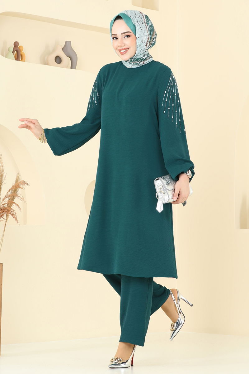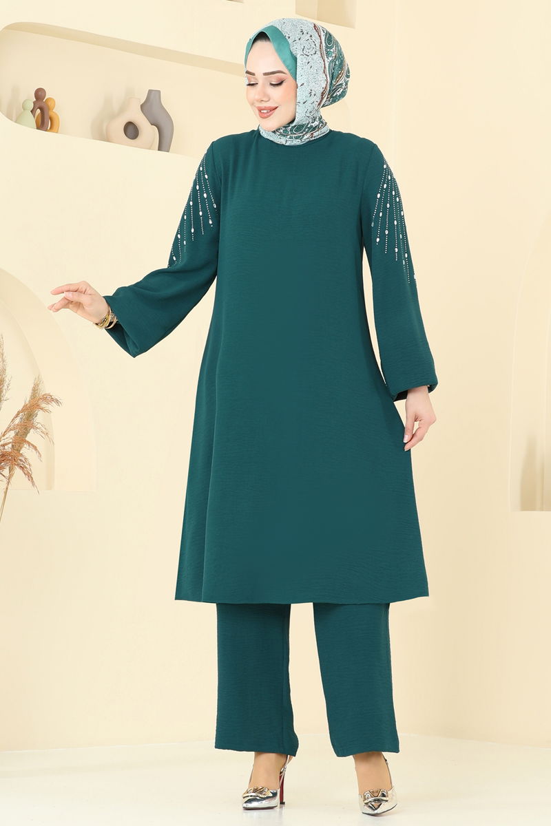 Shine in the Stone Detail Set This hijab set brings together elegance with its expanded bicycle neck and glued stone details, offering comfort and elegance throughout all four seasons. Easily washable at 30 degrees with delicate care, this aerobin fabric suit is not only ideal for everyday use but also for your special occasions. The tunic and pants feature elastic cuffs and a buttoned design on the back, prioritizing comfort while maintaining lightness with its lining-free structure. The size 38 on the model can be perfectly adapted to every size with its elastic belt at the waist.