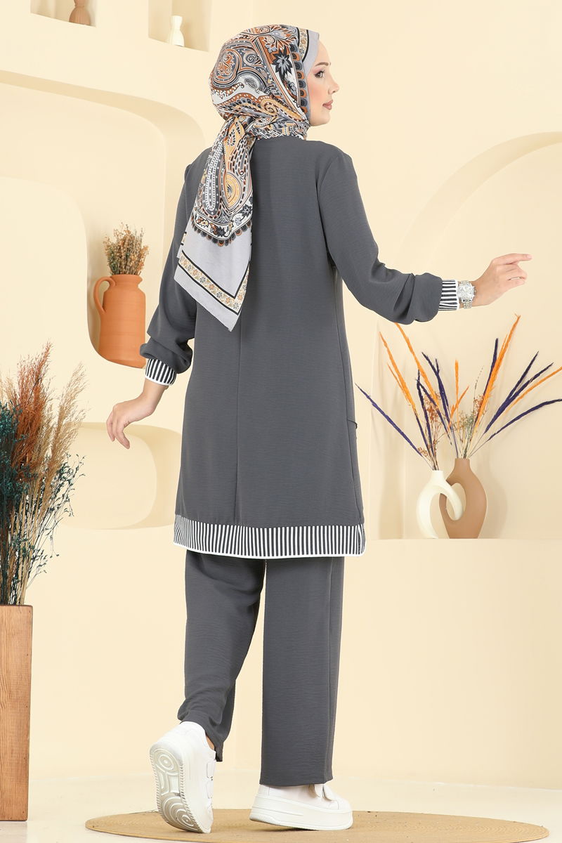 Garni Detail Suit is a modest fashion product suitable for all seasons. Made from special Aerobin fabric, it is light and breathable. It offers easy care with gentle wash at 30 degrees. The suit features a crew neck design and is unlined. The dress is a pullover, and the pants have an elastic waist. Ideal for both stylish and comfortable wear. (Displayed product is size 38.)