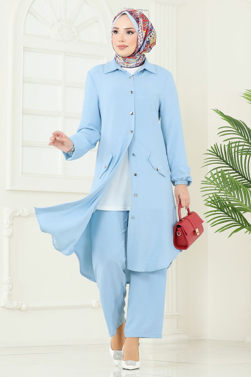 The Printed Team with Accessory Pockets, model, offers comfort in all seasons as a hijab outfit. Every detail is carefully designed, and this elegant set is made of aerobin fabric. The shirt collar and front-button design, along with slit buttons, provide an aesthetic look. The long-sleeved inner tunic has an elasticated cuff, and the trousers feature an elastic waistband. The print patterns express your style, and it is recommended to wash inside out and iron on the reverse side for easy maintenance. Complete with , Tunic, and Trousers, you can comfortably use this set in any setting.