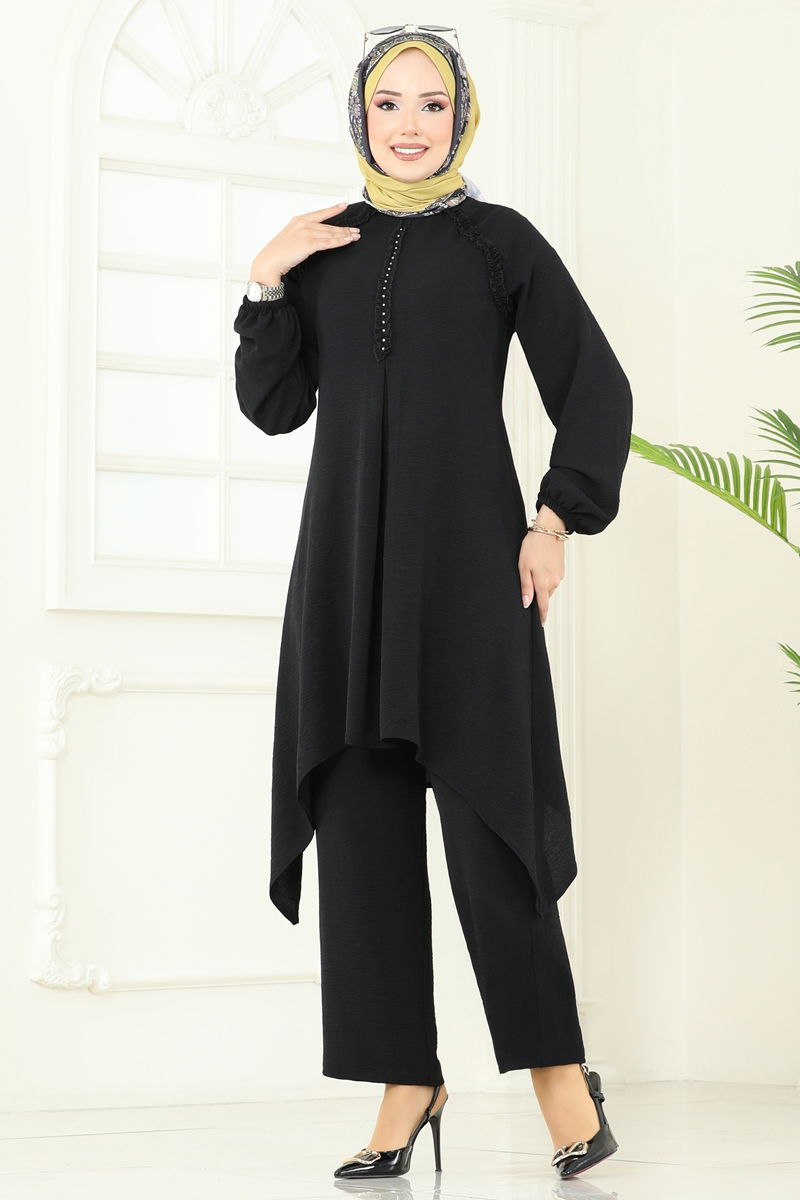 Asymmetric Cut Set is specially designed for modest fashion, offering all-season wearability. It can be washed gently at 30 degrees and is made from aerobin fabric. This set features a crew neck and a lining-free design that provides a contemporary look. The elastic cuffs on the tunic and pants enhance comfort, while the button detail at the back adds stylish finishing touches. The elastic waistband on the pants ensures comfort throughout the day.