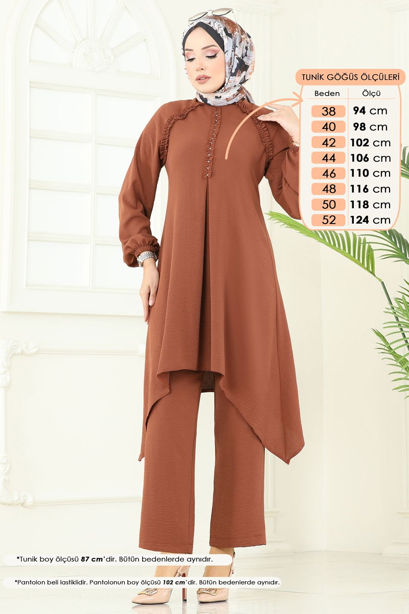 Product Feature : It is a new season hijab fashion product. It has a button that can be used from the back. The product has a Cycling collar. Unlined. The stones are glued. The waist of the trousers is elastic. The cuff is rubberized. There may be a tonal difference in the product due to concept photo shoots.