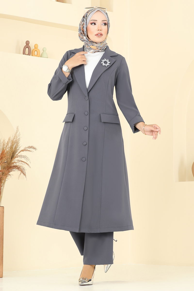 Product Feature : It is a new season hijab fashion product. The product has a Double-breasted collar. The product has From the front buttons. Unlined. Belt included, optional not available. Pocket details are accessories. The waist of the trousers is elastic. There may be a tonal difference in the product due to concept photo shoots.