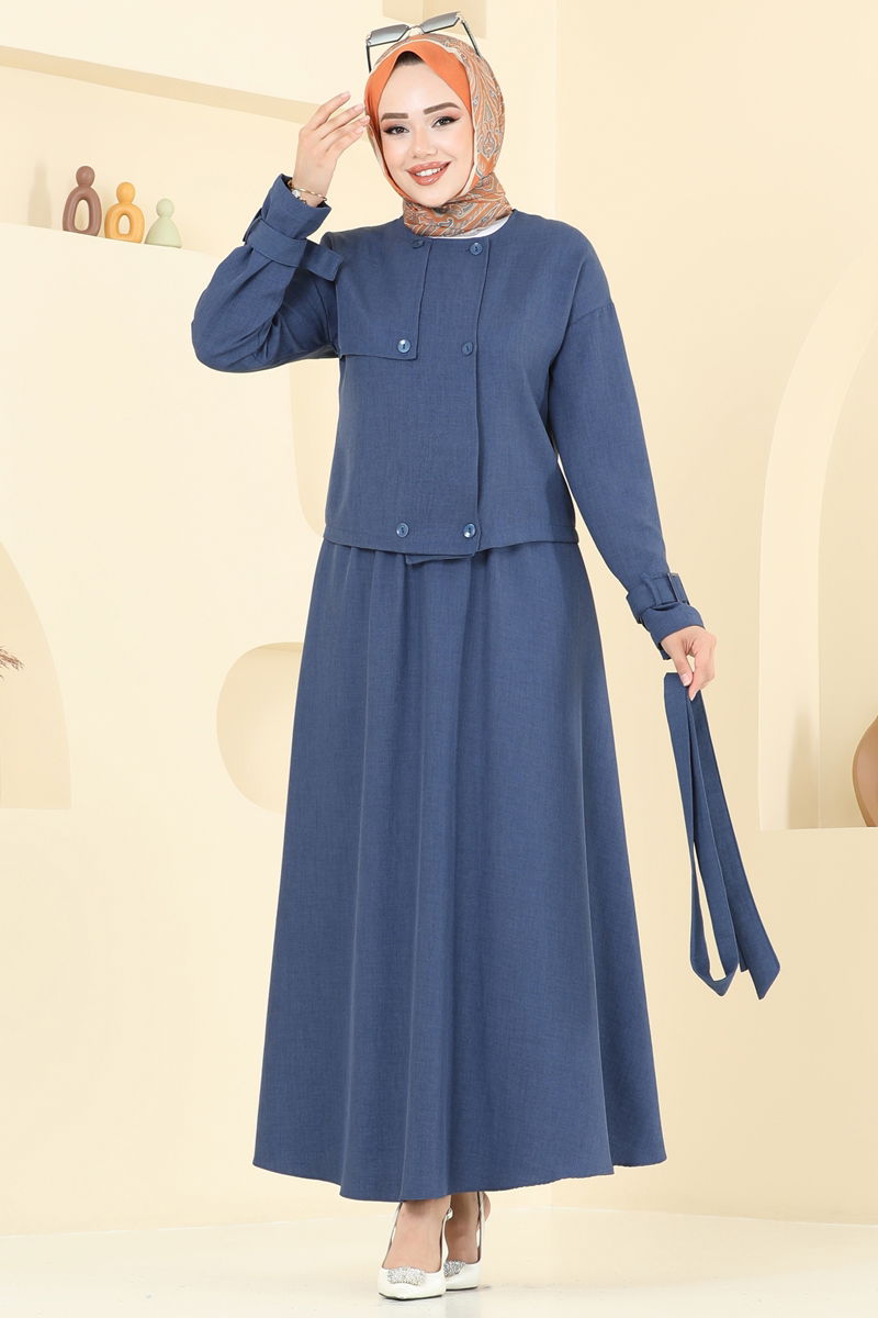 The Cuff-Buttoned Sofia Suit stands out with its Sofia Combination Design, providing a modern and chic look. Made from Sofia linen fabric, this modest wear is suitable for gentle washing at 30 degrees. The outfit features a mandarin collar and front button design, ensuring comfortable wear. With its unlined structure, it offers lightness, and the elastic waistband of the skirt provides a comfortable fit. Comprising a blouse and skirt, this set is perfect for both everyday and special occasions.