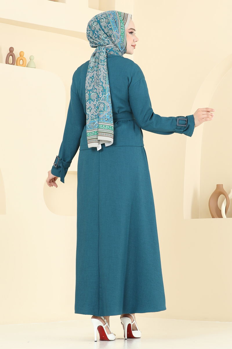 The Cuff-Buttoned Sofia Suit stands out with its Sofia Combination Design, providing a modern and chic look. Made from Sofia linen fabric, this modest wear is suitable for gentle washing at 30 degrees. The outfit features a mandarin collar and front button design, ensuring comfortable wear. With its unlined structure, it offers lightness, and the elastic waistband of the skirt provides a comfortable fit. Comprising a blouse and skirt, this set is perfect for both everyday and special occasions.