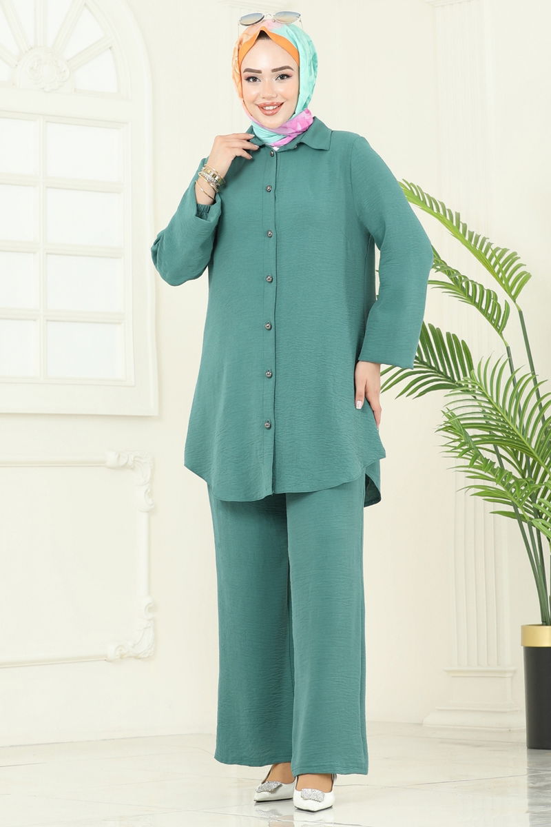 Product Feature : It is a new season hijab fashion product. There is a zipper that can be used from the back. The fabric on the back body is garni fabric and is sewn onto the product.The product has a Shirt collar. The product has From the front buttons. Unlined. The product has a zipper at the from the back part. The waist of the trousers is elastic. The cuff is rubberized. There may be a tonal difference in the product due to concept photo shoots.